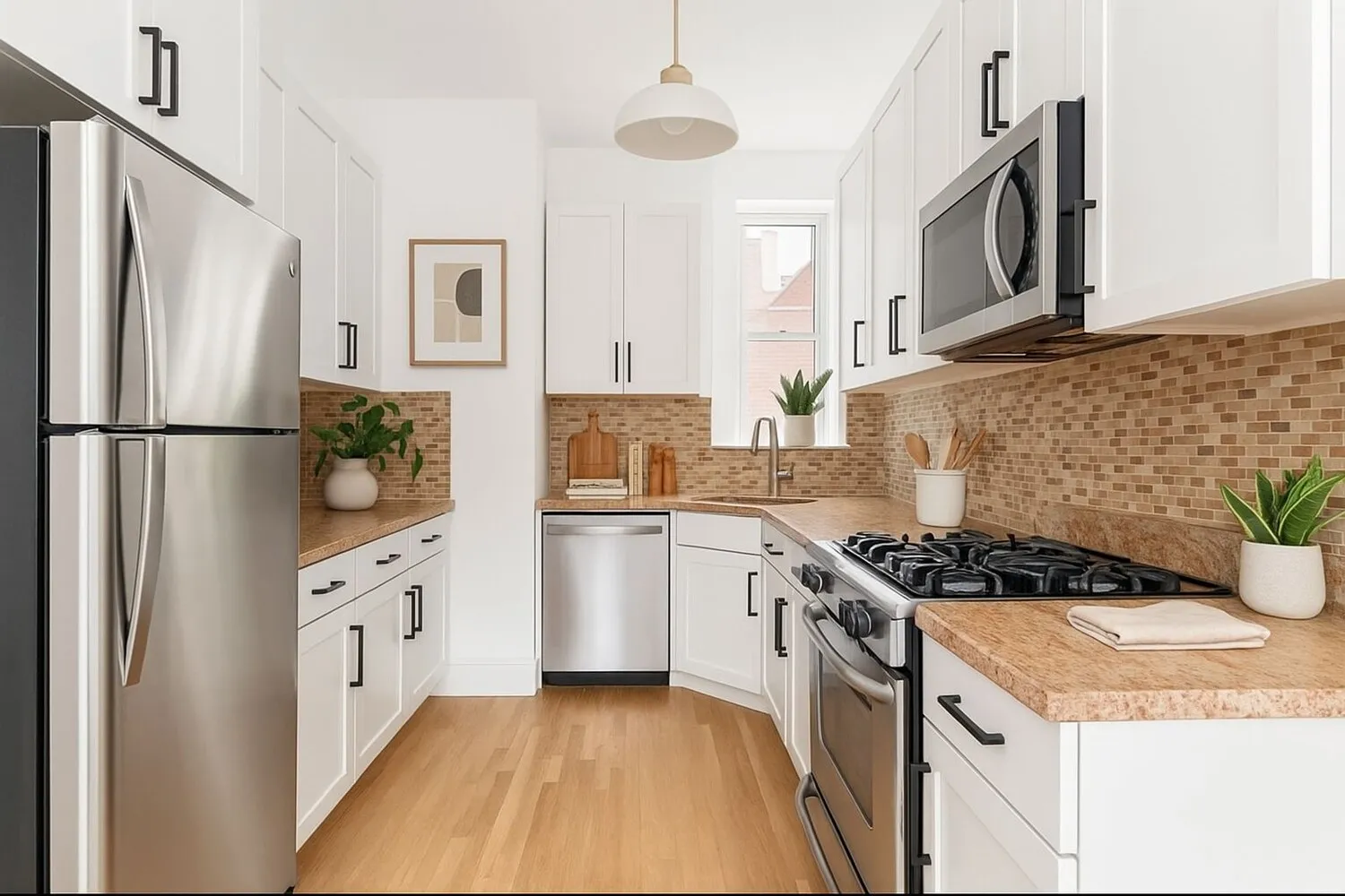 The sun-drenched living and dining area faces south with oversized windows and flows into a stylish, windowed kitchen with granite countertops, stainless steel appliances, and ample cabinetry. Both bedrooms are located at the quiet rear of the home, offering peaceful, light-filled retreats. The oversized primary bath features subway tile, Kohler fixtures, and a rainfall shower. Additional highlights include a full-size in-unit washer/dryer, multiple ELFA closets, built-in shelving, and a deeded storage unit.