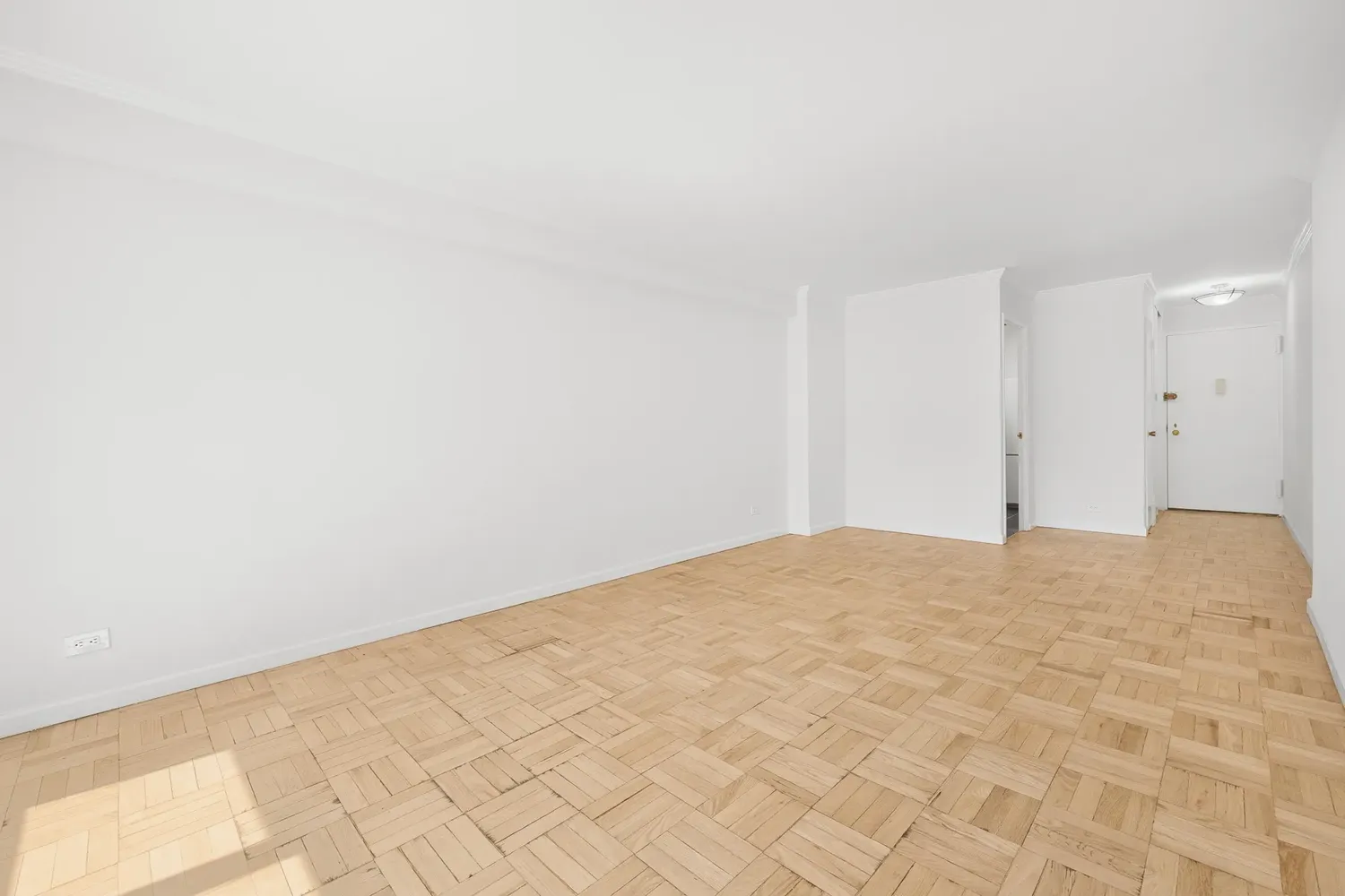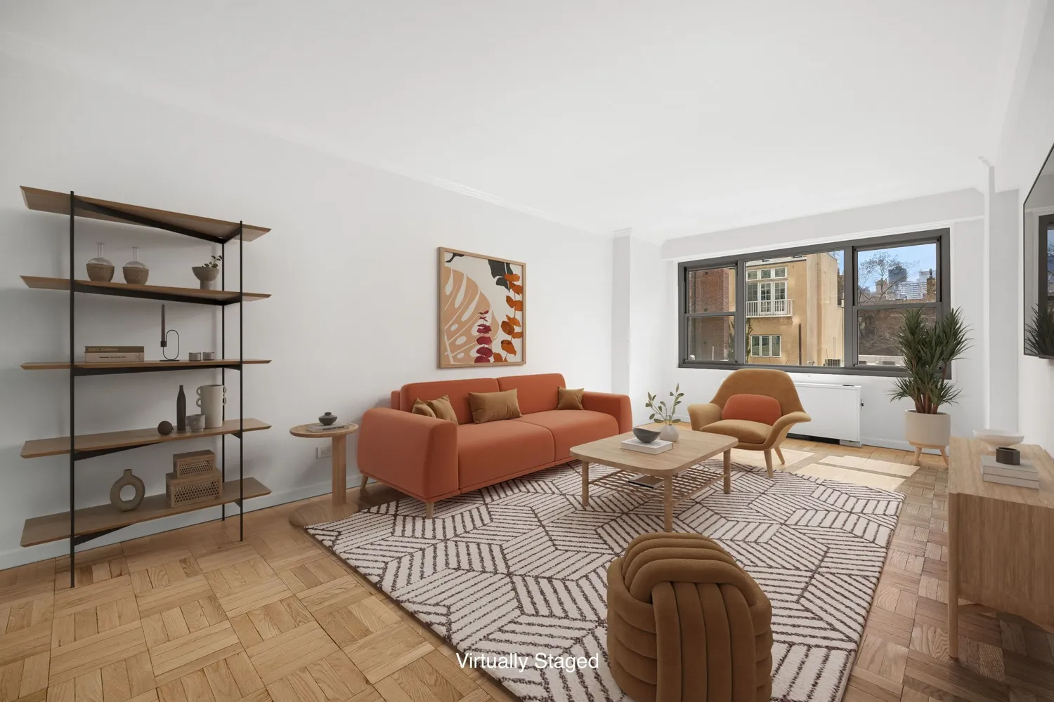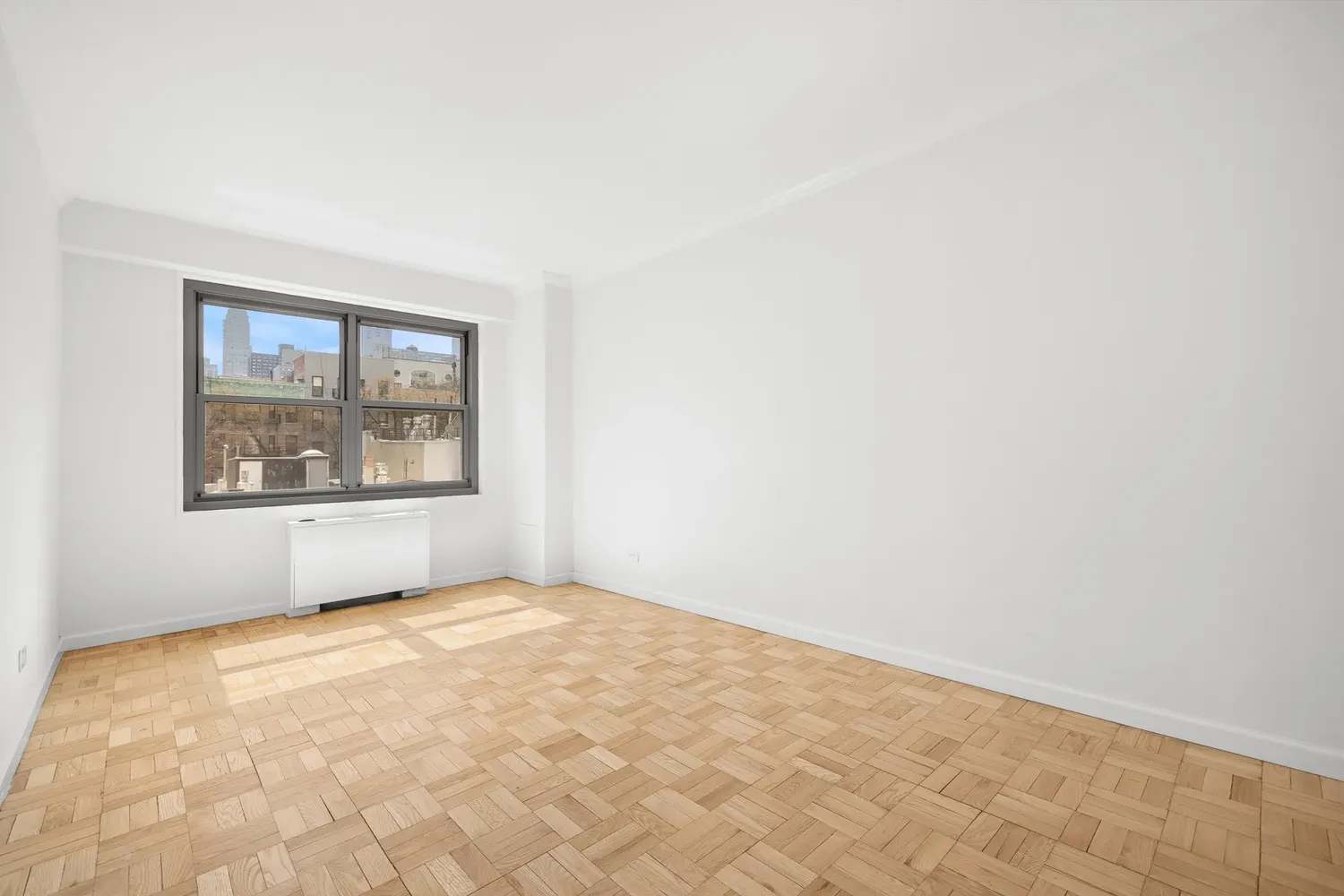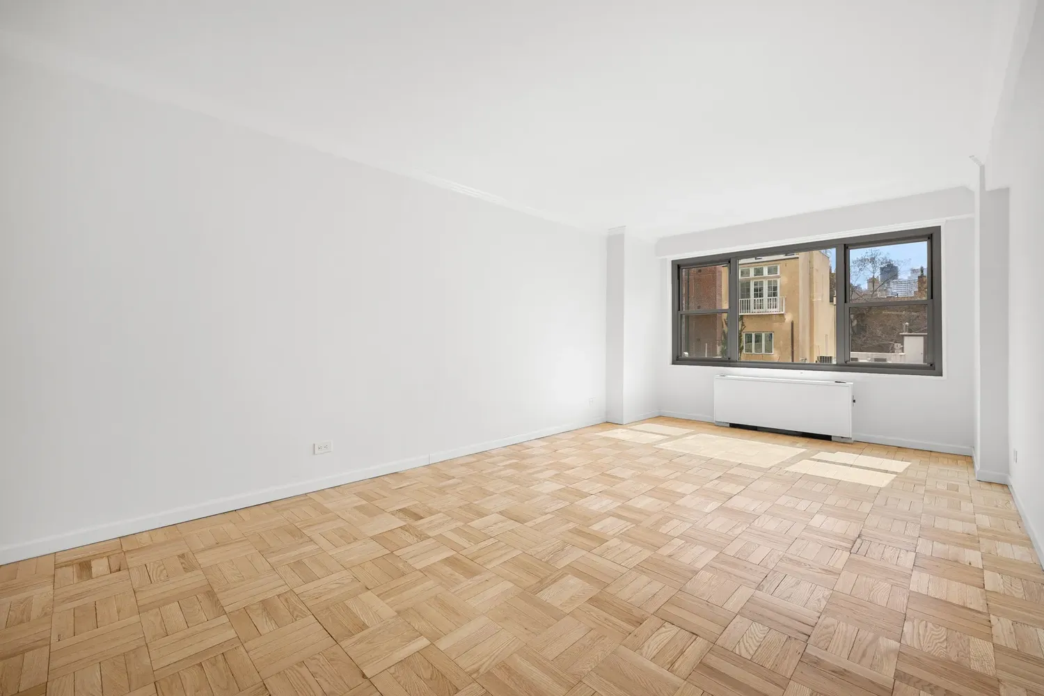 The layout is a true one-bedroom, not a conversion, with an easy, functional flow. The living room is spacious and flexible, with room for a comfortable seating area, a media setup, and a dining corner without feeling crowded. Hardwood parquet floors run throughout, and five closets provide exceptional storage for an apartment of this size.