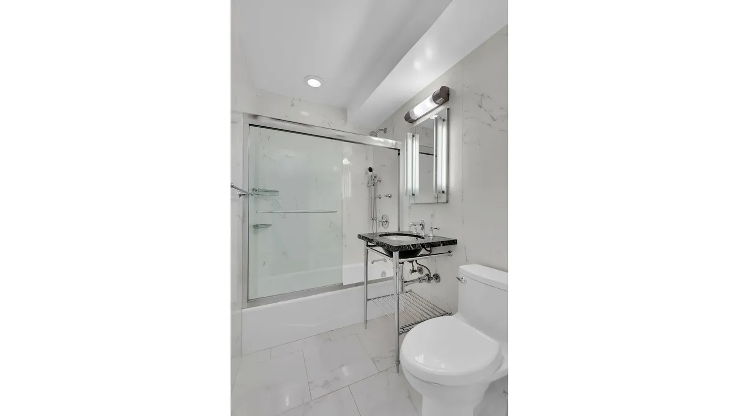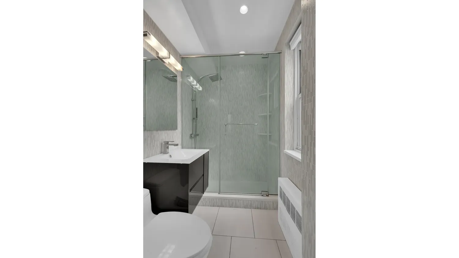 The corner primary bedroom offers dual exposures, room for a king-size bed, a dedicated workspace, and ample closet space. The renovated windowed en-suite bath features a custom shower, marble tile, Porcelanosa countertops, and Kohler fixtures. The second bedroom is bright and versatile - equally suited as a guest room, home office, or nursery - with a well-appointed second bath. Through-wall A/C in every room ensures year-round comfort.