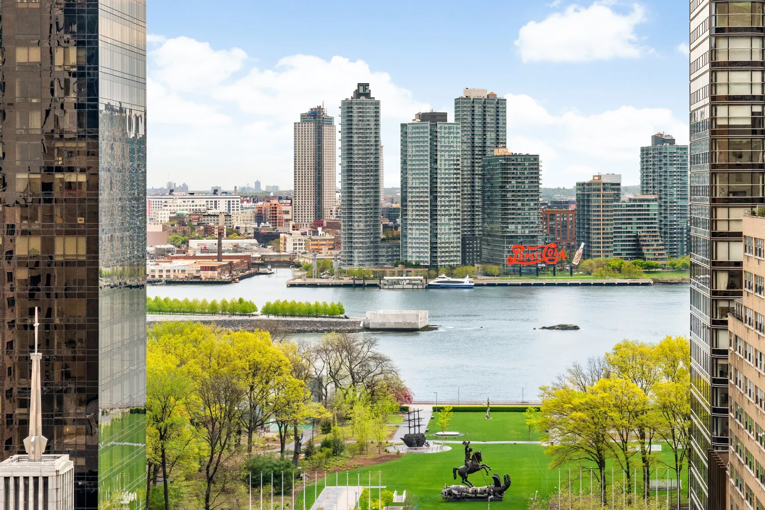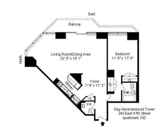 Residence 10D at the Dag Hammarskjold Tower, a generously proportioned 1-bedroom, 1.5-bath condo located at 240 East 47th Street in Midtown East. Offering approximately 1,074 SF of thoughtfully designed interior space, this home features 9-foot ceilings, excellent natural light, and open north and east exposures with sweeping views of Dag Hammarskjold Plaza, Katherine Hepburn Garden, the United Nations North Lawn, and the East River.