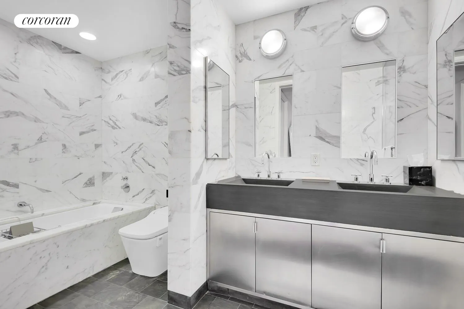 Each luxury bath has marble lined showers and marble encased, soaking tubs. The very large primary bath has beautiful Dombracht fixtures, a custom-installed Toto toilet, one-piece carved out vanity in Positano stone, cast-iron soaking tub, and separate glass enclosed shower.