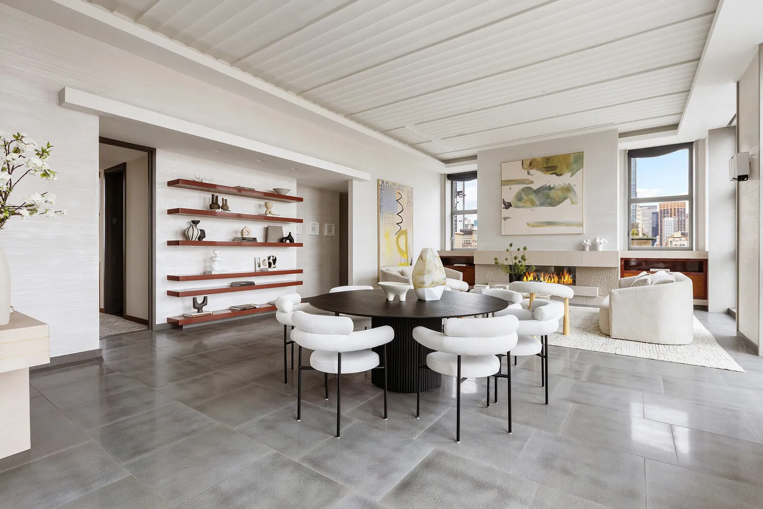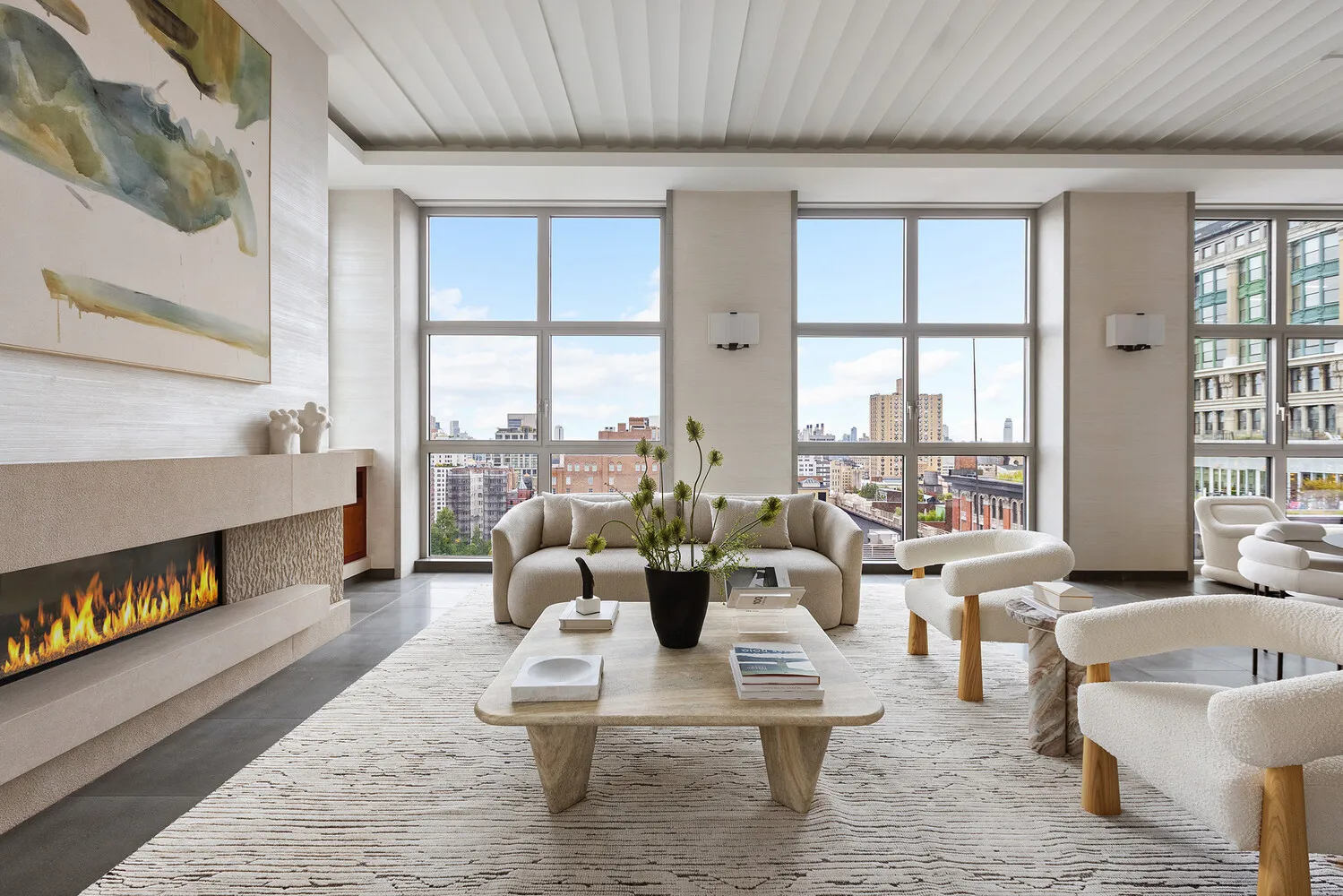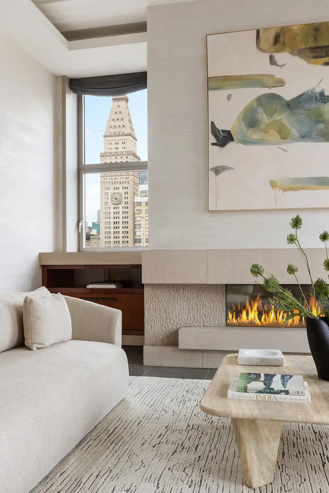The dramatic great room features a gas fireplace with a limestone surround, a large dining area, and a dry bar, all complemented by a Crestron-controlled lighting and audio system. Floor-to-ceiling, museum-grade UV-protected windows frame sweeping views of Gramercy Park, the Chrysler Building, and the Empire State Building.