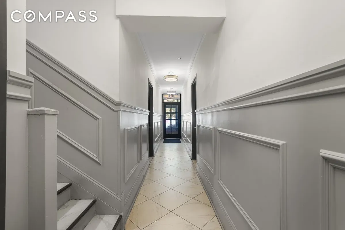 Freshly painted and filled with natural light, the home spans the full width of the building, featuring both eastern and southern exposures that illuminate the space throughout the day. A gracious entry with coat closet opens into a spacious living room creating an inviting and welcoming atmosphere. High ceilings and abundant closet space are found throughout.
