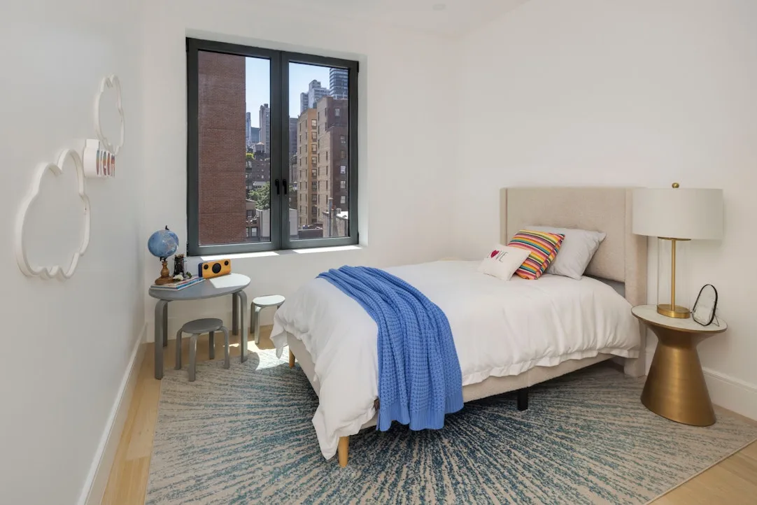 The bedroom wing is discreetly tucked away from the living spaces and contains a laundry room with a Miele washer and dryer. Three large secondary bedrooms feature large-scale windows with skyline views, and each is complete with vast closet space. The primary bedroom sits at the end of the bedroom wing. This magnificent south and east facing suite includes an oversized window with skyline views and a gracious walk-in closet with room for significant storage and dressing space. The brilliantly appointed five-piece primary bathroom, with radiant heated floors, features North Pearl marble, a custom vanity and recessed medicine cabinet by BOTTEGA, and Hansgrohe chrome fixtures.