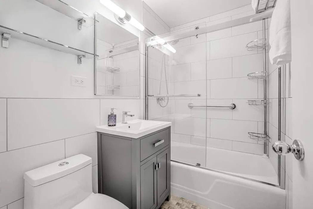 The brand-new renovated bathroom is a standout, featuring frameless glass shower doors, modern fixtures, and a clean, contemporary aesthetic. Hardwood floors run throughout, adding warmth and elegance. Storage is abundant as well, with multiple generous closets designed to keep your home organized and clutter-free.