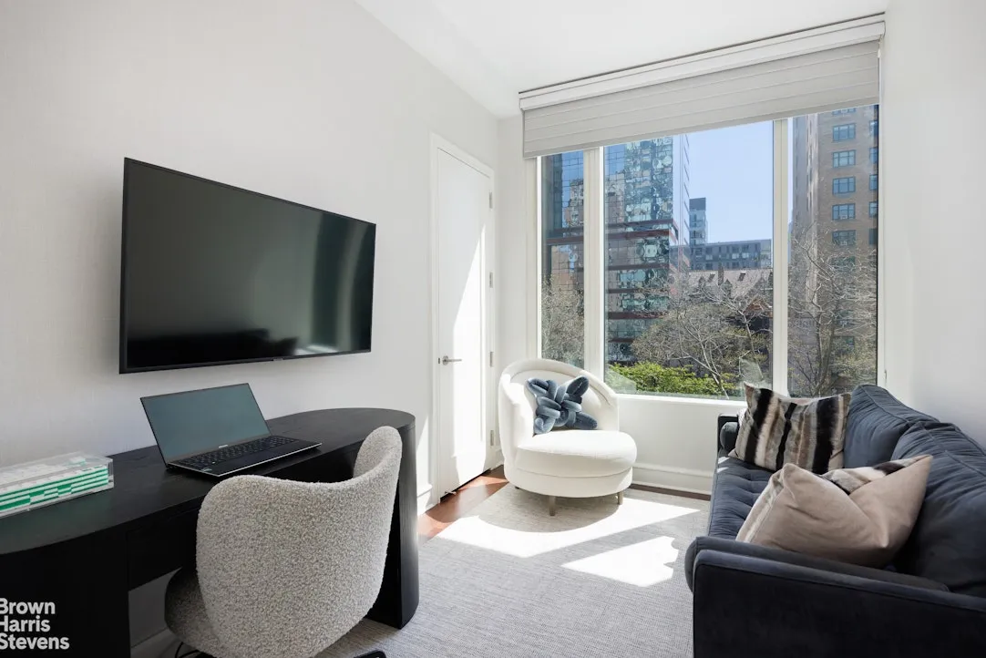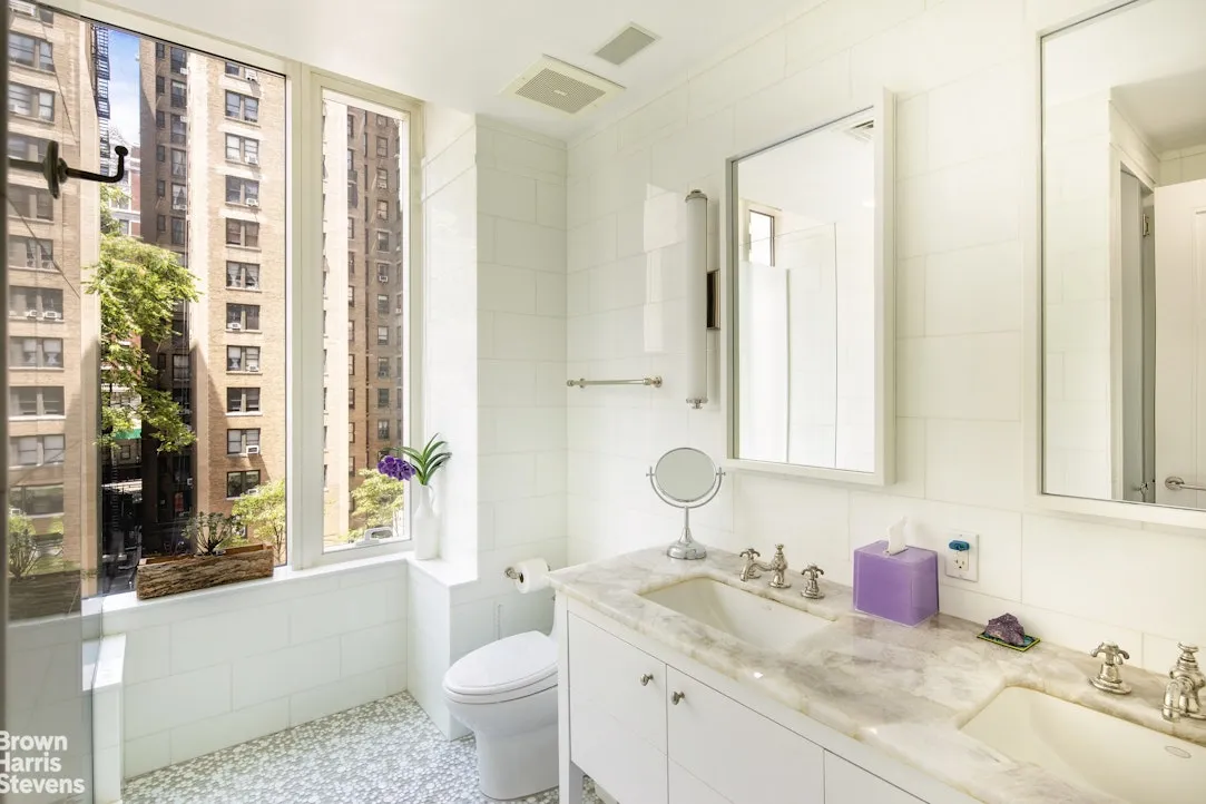 In the bedroom wing there are 4 generously proportioned bedrooms and 3 full bathrooms. The tranquil master suite has abundant closet space with wonderful built ins and an oversized walk-in closet. The spa like master bathroom has floor to ceiling windows, beautiful tiling, a double onyx vanity, and large glass-enclosed shower. Two of the three bedrooms in the bedroom wing share a double vanity limestone bathroom with tub and the fourth bedroom has its own en suite limestone bathroom. All of the bedrooms have spacious closets with custom interiors, great light, and are pin drop quiet facing West into the peaceful 100-foot deep and tree-lined courtyard garden of the building.