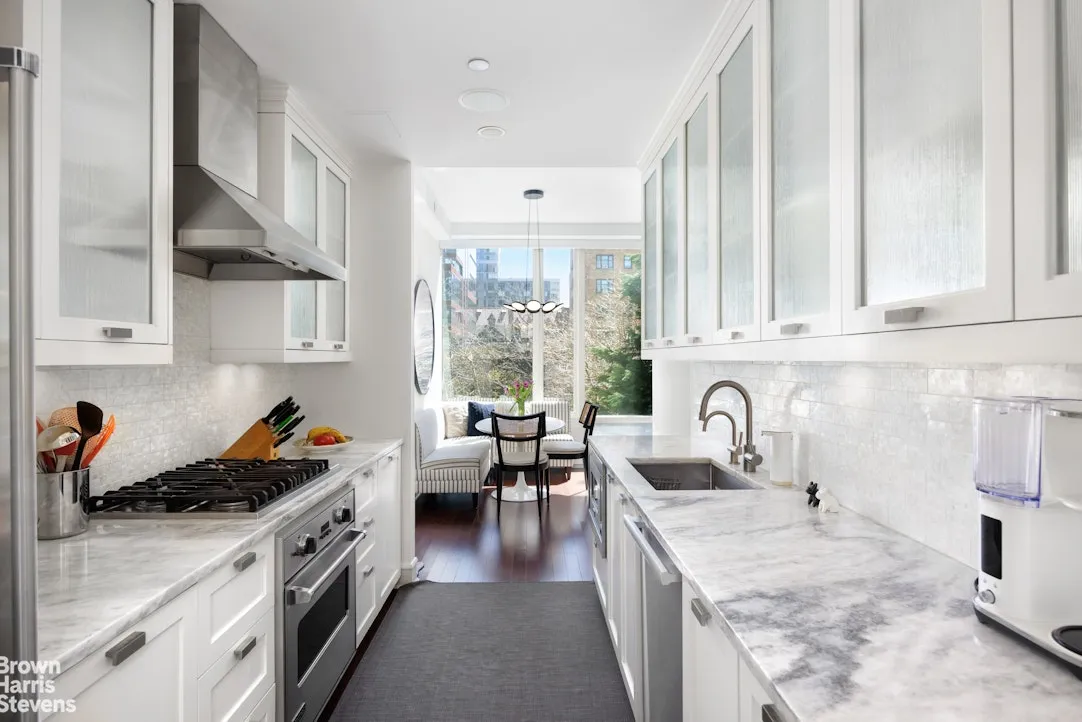 The entertaining space is highlighted by a sprawling 32 foot long great room with beautiful tree views and tons of light from floor to ceiling windows. Off the living room is a partially open renovated chef's kitchen. The kitchen features Viking and Miele appliances, a vented stove, wine refrigerator, and stunning natural quartzite counters and abalone backsplash.