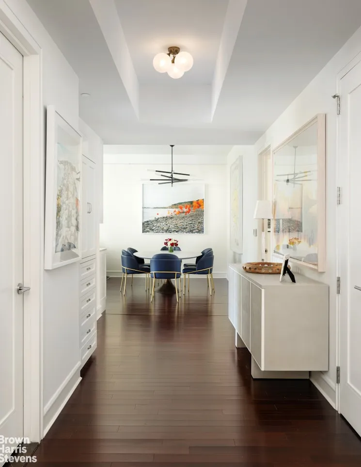Enter into a gracious gallery with two spacious coat closets. Off the gallery is a beautiful full bathroom with a glass-enclosed shower and additional storage space. This bathroom also functions as a powder room.
