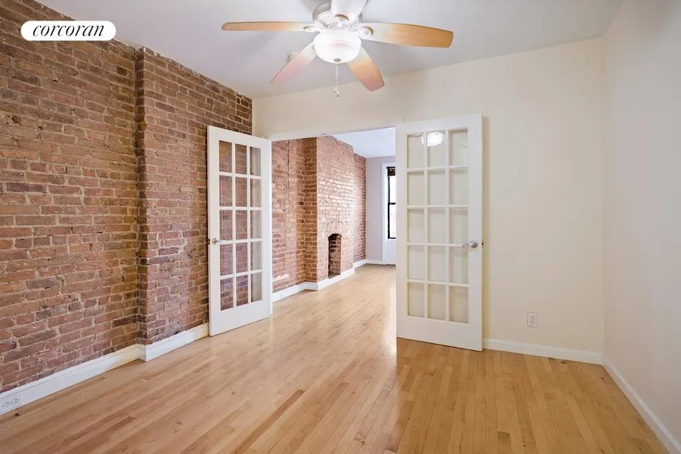 The apartment exudes classic New York City character, featuring high ceilings, warm hardwood floors, and a dramatic exposed brick wall with a decorative fireplace that anchors the living room. Elegant French doors separate the living area from the bedroom, allowing sunlight to sweep through the entire apartment while maintaining a flexible, airy layout.
