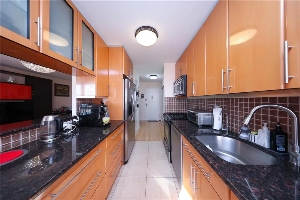 A Beautifully Renovated 2-Bedroom Co-op with Stunning Ocean Views, Welcome to this absolutely beautiful, top-quality renovation of a two-bedroom, one-bath co-op located in a prime Bath Beach neighborhood. This home offers a perfect blend of modern luxury and comfortable living with breathtaking water views — enjoy both sunrise and sunset right from your private terrace! Enter inside to find an open-concept kitchen with all brand-new appliances, including a modern dishwasher, stove, and refrigerator. The stylish breakfast bar and dining area flow seamlessly into a spacious living room filled with natural light from newly installed windows and a new terrace door. The bathroom has been completely upgraded with elegant marble floors, sliding glass doors, and high-end finishes. Both bedrooms feature custom closets, new hardwood floors, new windows, and new built-in A/C units, offering total comfort and modern style. This well-maintained building provides 24-hour security, a live-in super, lobby lounge, laundry room, storage space, and assigned parking. Conveniently located near the D train, schools, parks, and 86th Street shopping, this home offers the perfect balance of peace, comfort, and city convenience.
