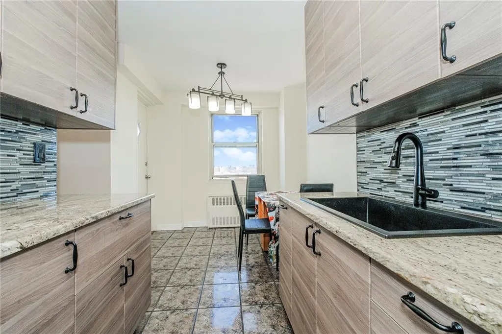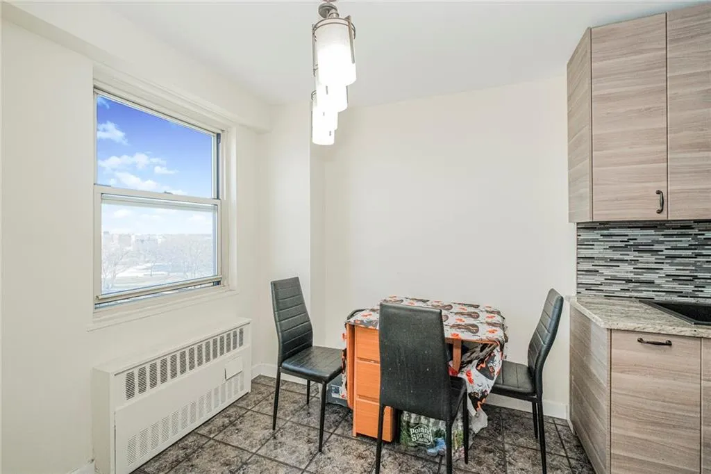 The updated kitchen features a dedicated dining area and provides direct access to a spacious private balcony—perfect for morning coffee or evening relaxation while enjoying beautiful Manhattan skyline views.