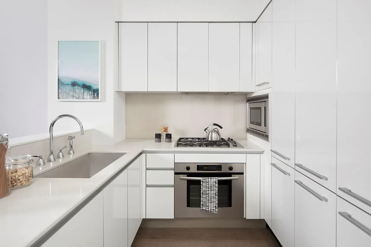 Residence 21I spans over 1,532 square feet, featuring premium hardwood floors and soaring 11' ceilings. The open kitchen features stainless steel Bosch appliances, Caesarstone countertops, and a built-in Lazza crystallized breakfast bar. Sleek Poliform cabinetry adds a touch of elegance seamlessly integrating a full-size Liebherr refrigerator, Miele dishwasher, and an in-unit washer and dryer. The kitchen’s modern design perfectly blends style and functionality, creating an ideal space for both everyday living and entertaining.