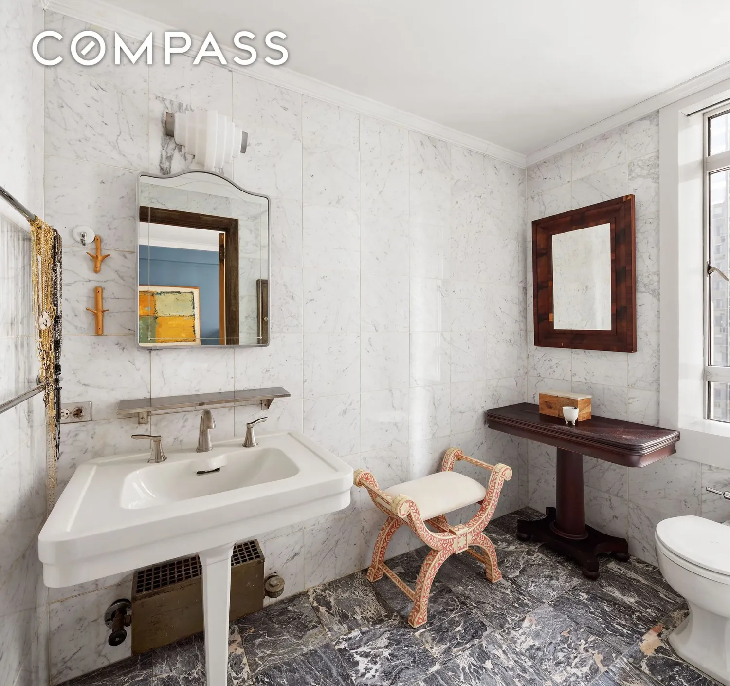 The bedrooms in the residence offer classic pre-war scale, timeless moldings, and generous closet space. The bathrooms, one of which is ensuite off the primary bedroom, offer a classic elegance and scale of a bygone era. The second bedroom can be closed off to create a guest suite with ensuite bathroom.