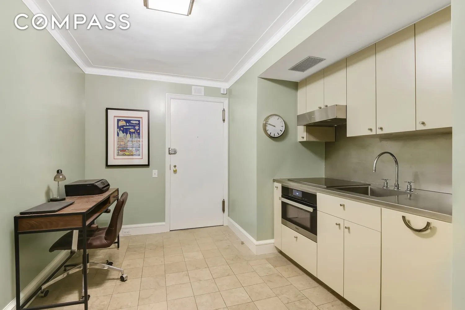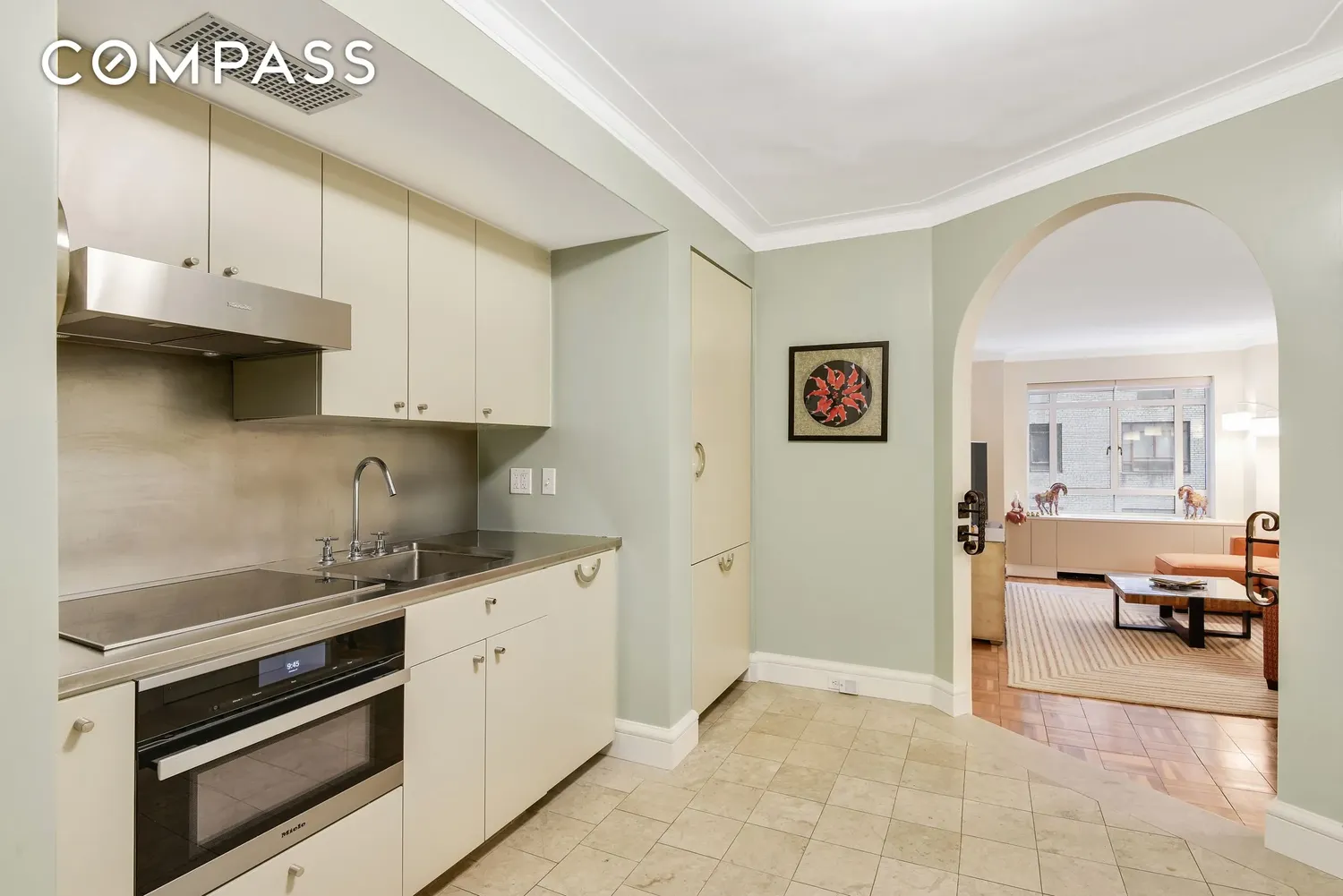 The eat-in kitchen is outfitted with top-of-the-line Miele appliances, including an electric stove and oven, dishwasher, and refrigerator. Sleek stainless-steel countertops and backsplash pair with ceramic tile flooring, while a large walk-in pantry and ample room for a dining table make the kitchen both functional and inviting.