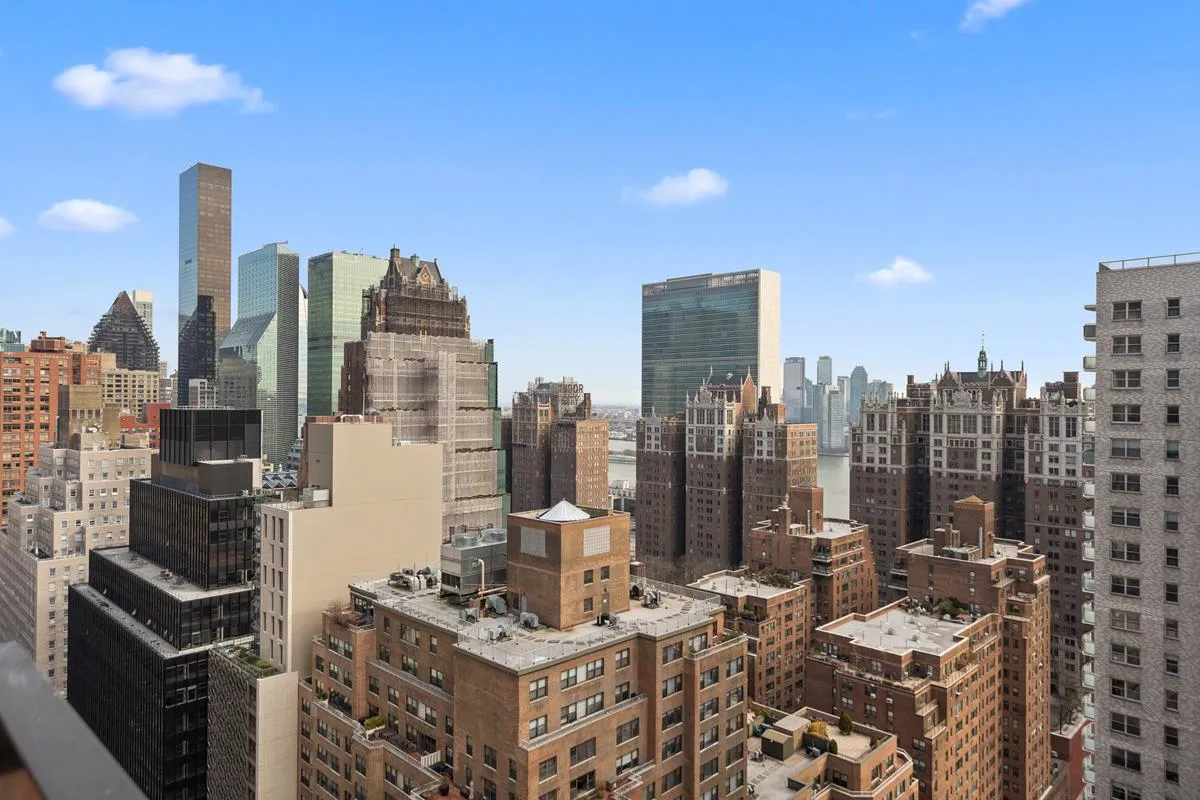 The expansive living and dining area flows seamlessly onto your private balcony, creating a rare indoor-outdoor experience high above the city. Whether sipping morning coffee or hosting friends at sunset, enjoy open skyline views along Second Avenue and east toward the East River—a daily reminder that you live somewhere special.