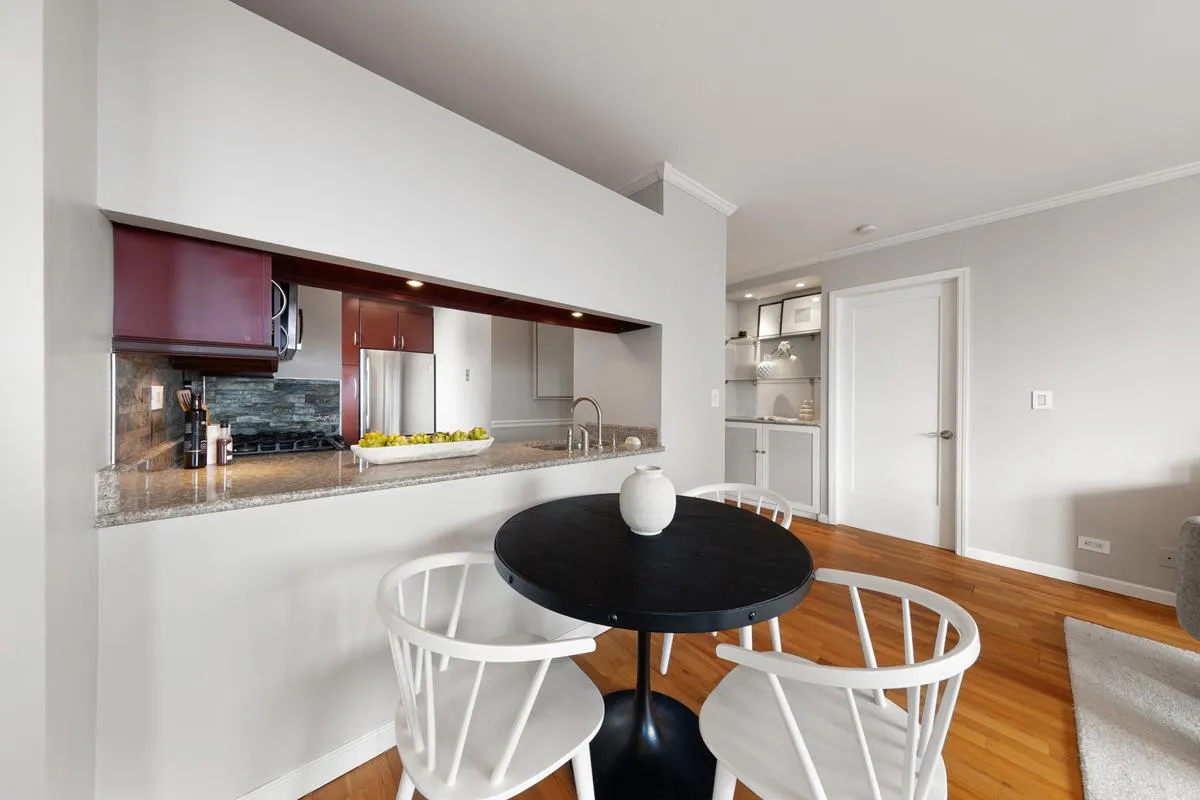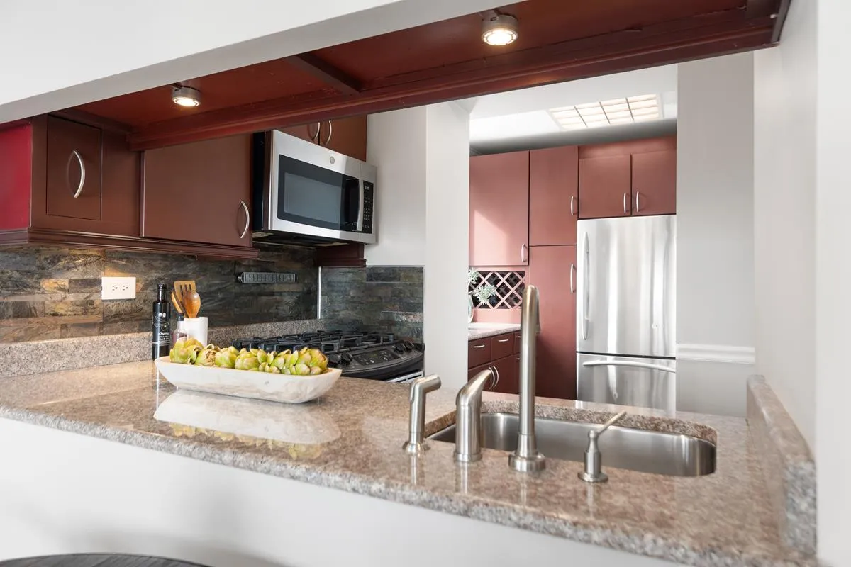 The windowed, south-facing kitchen is both practical and inviting, filled with natural light throughout the day. Fully equipped with GE Profile appliances, including a full-size oven, four-burner range, microwave, dishwasher, and refrigerator, the kitchen also offers exceptional storage and a built-in wine rack—perfect for those who love to cook, entertain, or simply enjoy an organized, elegant space.