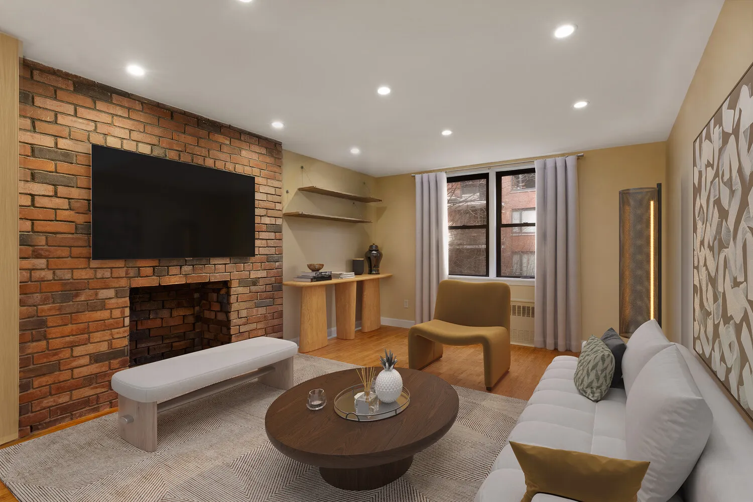 Inside, timeless details define the space, including exposed brick walls and a decorative fireplace that add warmth and texture. The open-concept kitchen and living area flow effortlessly, enhanced by custom closets in the living space that provide exceptional added storage. A gracious foyer creates a welcoming entry, while the thoughtfully designed layout includes a full bathroom and a spacious king-size bedroom with custom closets and recessed lighting - all bathed in beautiful southern light.