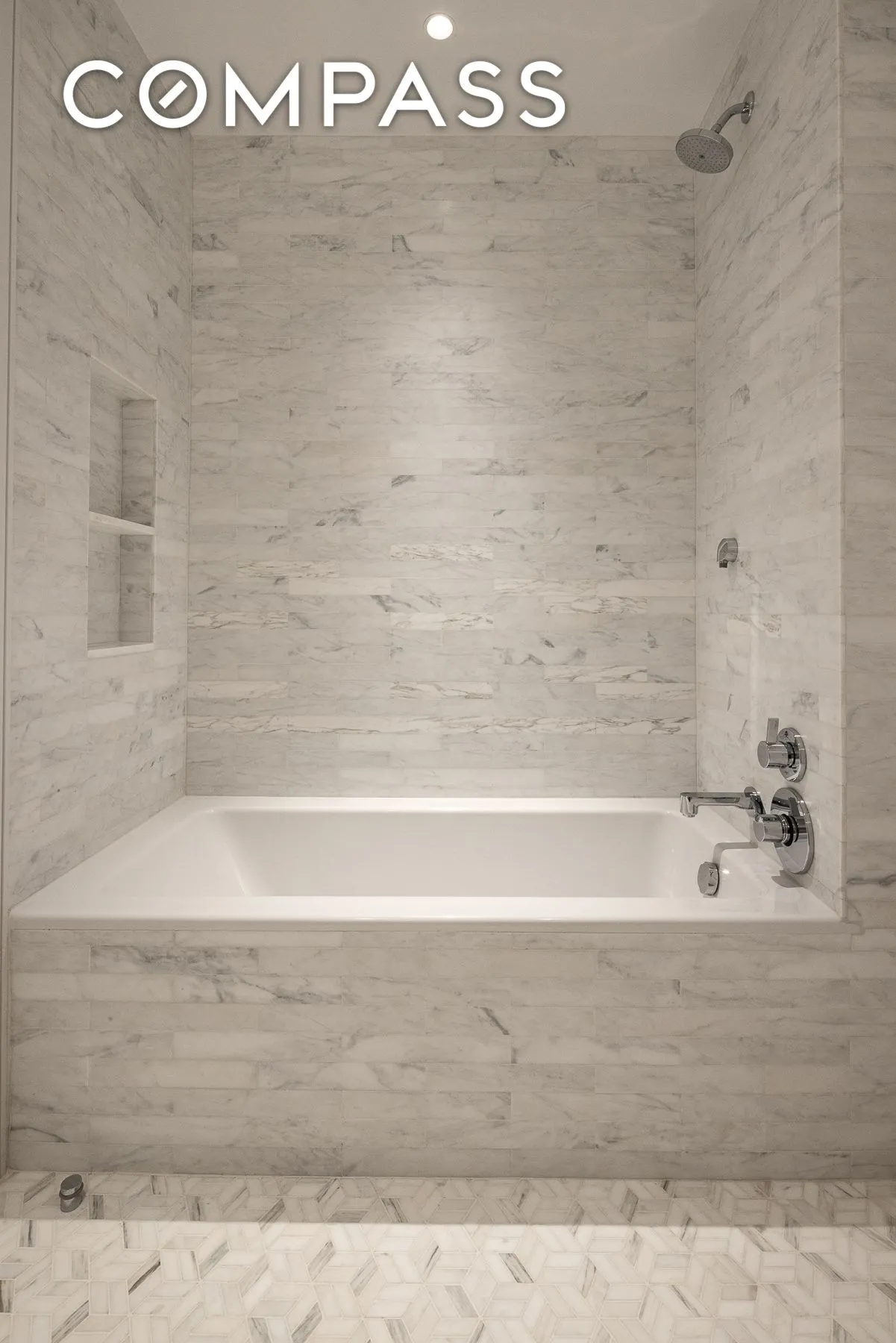 The oversized, south-facing primary suite offers open city views and an en-suite marble bath with radiant-heated floors, soaking tub, glass-enclosed shower, dual sink vanity, Waterworks fixtures, separate WC with Toto Neorest commode, and two oversized closets.