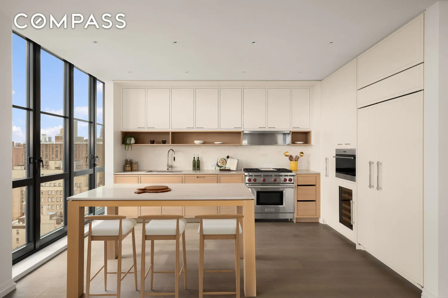 The top-of-the line chef's kitchen features Italian solid white oak cabinets with exposed dovetail joinery, elegant inlay detail and under cabinet lighting. Brazilian desert quartzite countertops are complemented by a marble backsplash, and the stainless steel appliances include Sub-Zero refrigerator, wine fridge & dishwasher, Wolf speed oven, vented gas range with grill, and a deep undermount sink with insinkerator. A moveable white oak island seating six, adds extra counter space and a spot for casual dining.