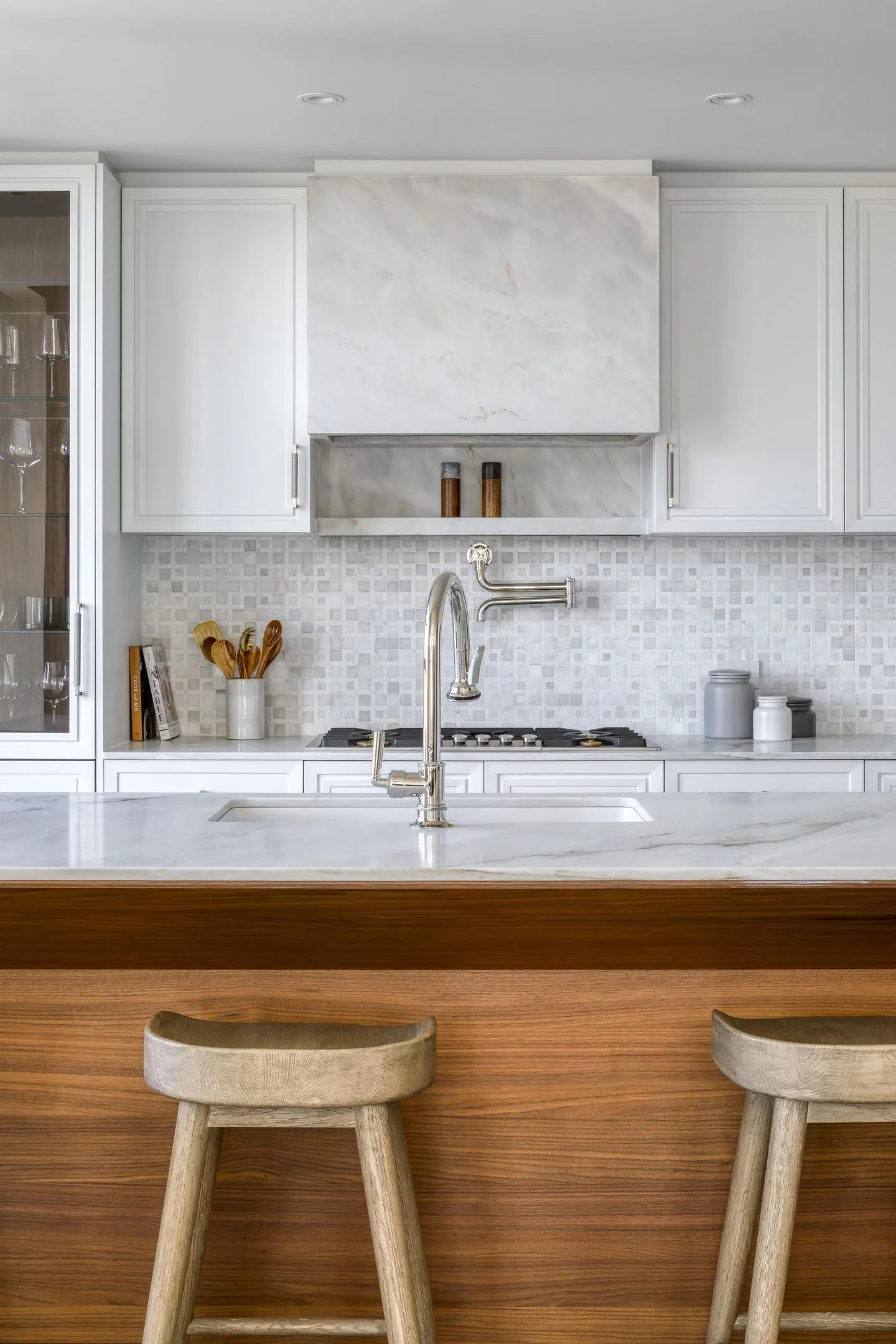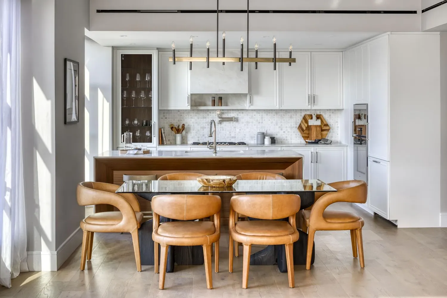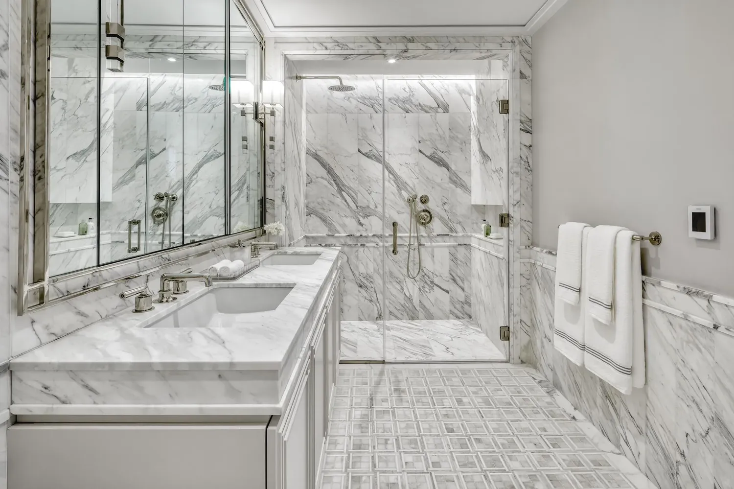 This high-floor and spacious three-bedroom, two-and-a-half-bathroom residence on the northeast corner spans 2,122 square feet. As you step into the gracious foyer, you’ll be greeted with white oak herringbone flooring, three spacious closets, and a powder room featuring Calacatta Gold marble flooring and accent walls. The open living room boasts large windows overlooking the surrounding treetops, providing a serene ambiance filled with natural light. The kitchen is designed for both function and style, featuring crema delivato marble counters with a waterfall edge, white matte lacquer cabinets by Aster Cucine, and top-of-the-line Gaggenau appliances. Retreat to the luxurious primary bedroom with a four-fixture bathroom featuring Calacatta Gold and Thassos mosaic marble floors, slab walls, and a stall shower. The two secondary bedrooms share a four-fixture bathroom with a Bianco Venetino marble vanity top and double sink. All fixtures are finished in polished nickel by Waterworks. The side-by-side Bosch washer and dryer are conveniently located in a separate closet.