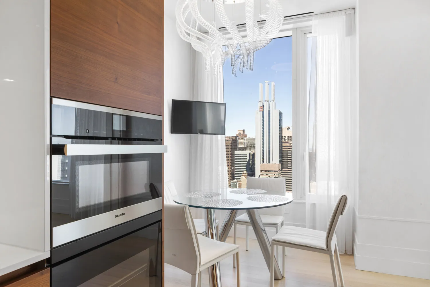 The vast 30' living/dining room wrapping the northwest corner has 11' ceilings and a balcony. The west facing windowed eat-in kitchen, custom designed by Daniel Romualdez and Eggersmann, has deluxe finishes including HanStone glass quartz countertops and backsplash, walnut cabinetry, Miele appliances: vented five-burner gas cooktop, wine refrigerator, dishwasher, two ovens (one with microwave & convection), and a 33" Kohler Stages Collection sink.