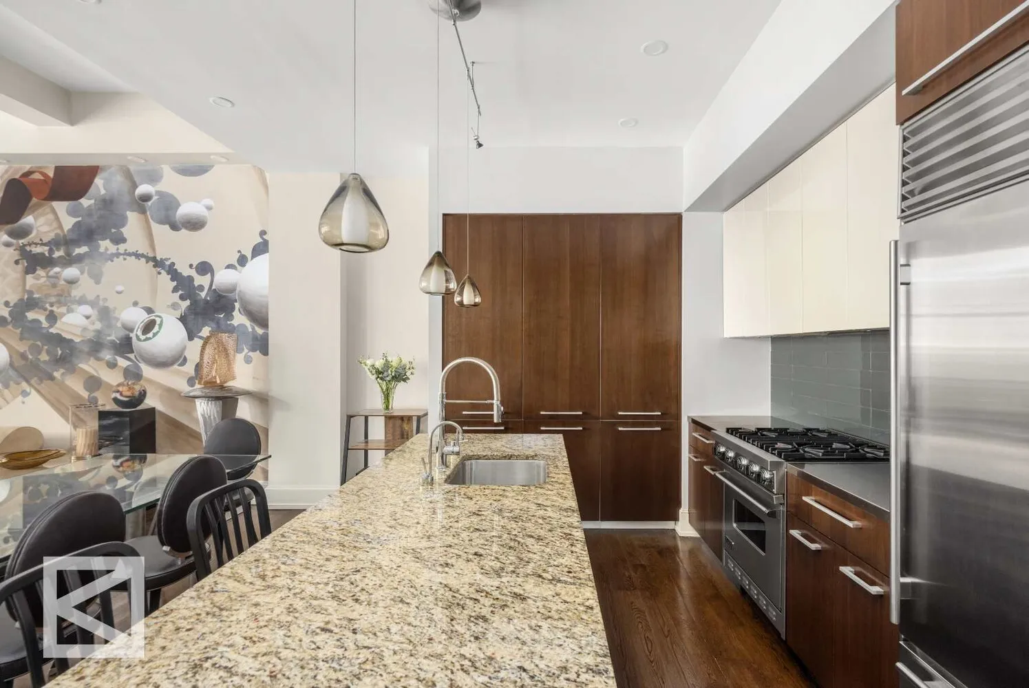 The kitchen has been elevated with six-slab stone surfaces, custom Italian cabinetry, premium Sub-Zero and Viking appliances, instant hot water, and garbage disposal, complemented by beautifully integrated built-in storage directly across. The second bedroom has been thoughtfully customized with bespoke millwork to function as a refined home office with a discreet Murphy bed.