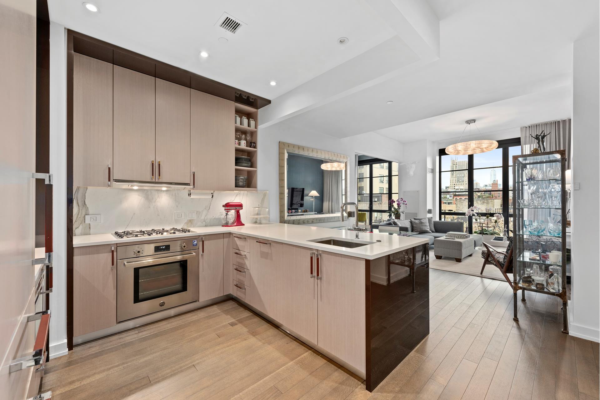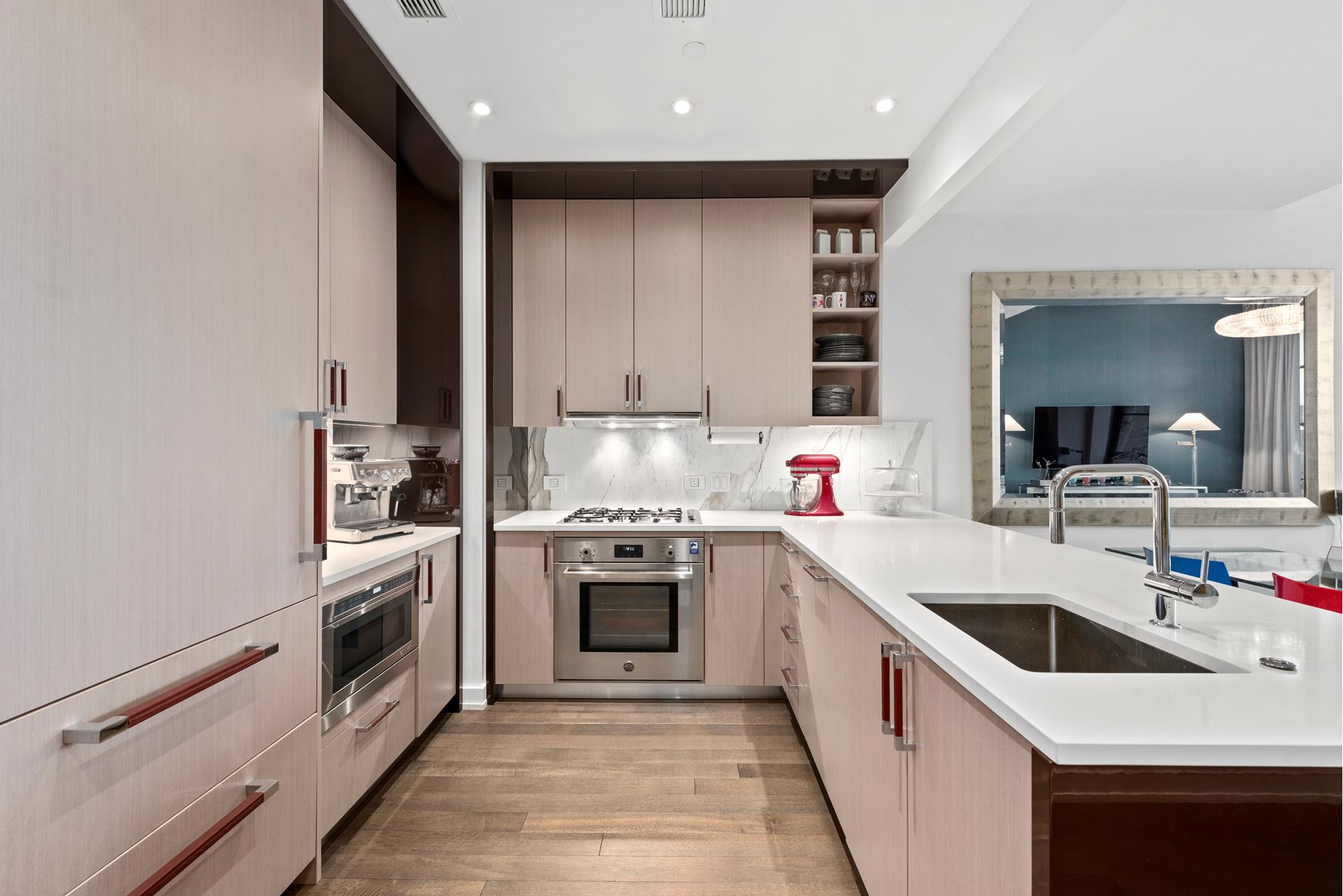The living area has a quintessential New York City view through floor-to-ceiling casement windows, with open skies looking south over Chelsea to One World Trade. With flexibility in mind, a custom Italian-made sliding wall can be opened to give you that option of hosting those idyllic dinner parties in an expansive space. 10-foot ceilings (10'), 4-inch wide plank hardwood flooring, crafty designer touches, custom built-ins and unlimited natural light through the entire day are just a few of the highlights that make this a very special home. The chef's kitchen features a Grohe faucet, marble counters, a Sub-Zero refrigerator, Bertazzoni oven and 6-burner cooktop and a Wolf microwave and wine cooler.