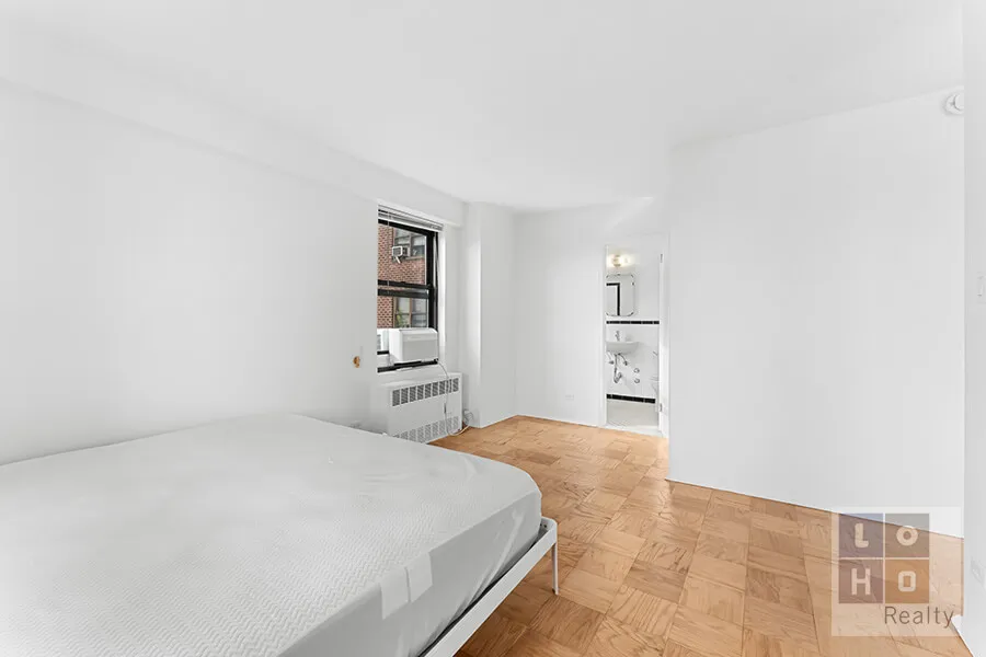 The generously proportioned bedroom enjoys double exposures to the south and east, a massive custom walk-in closet with sliding doors, and ample space to comfortably accommodate a king-sized bed, dresser, and additional furnishings.