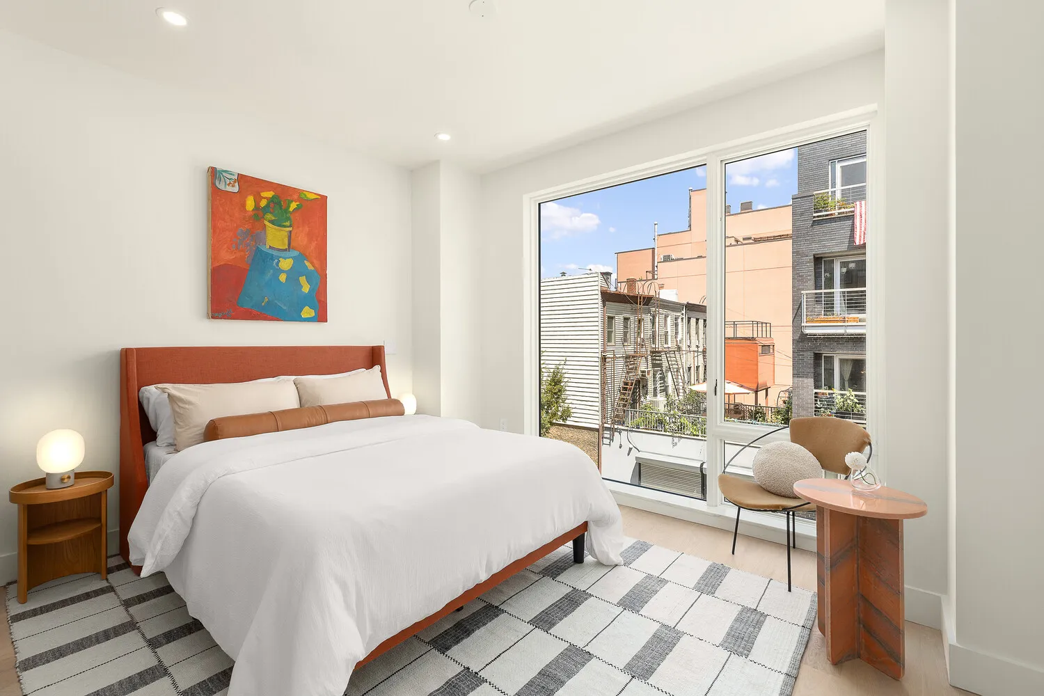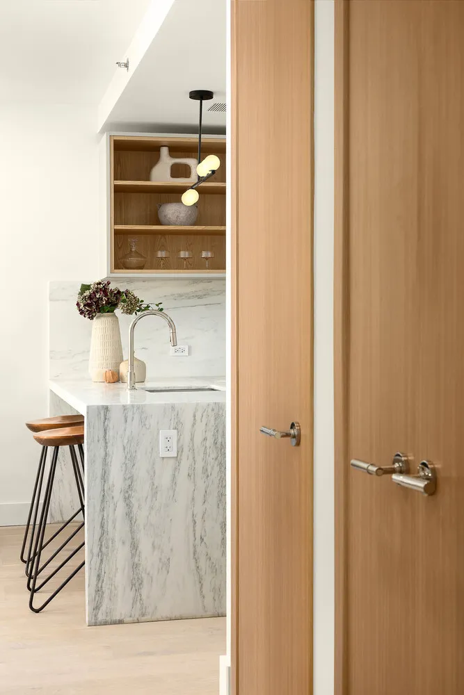 Flooded with sunlight through oversized windows, each residence boasts 7-inch-wide plank white oak flooring, solid core doors, and luxurious polished nickel hardware throughout. Chef's kitchens are finished with custom cabinetry in soft neutral tones, elegant marble countertops and backsplashes, designer lighting, and best-in-class Bosch appliances, including induction cooktops.
