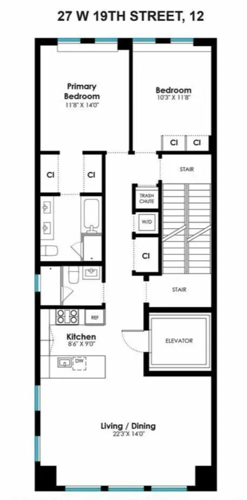 Perched on the 12th floor of a boutique Flatiron condominium, this immaculately renovated 2-bedroom, 2-bath residence offers three sunny exposures, a private keyed elevator entrance and central A/C controlled by WiFi-enabled Nest thermostat.