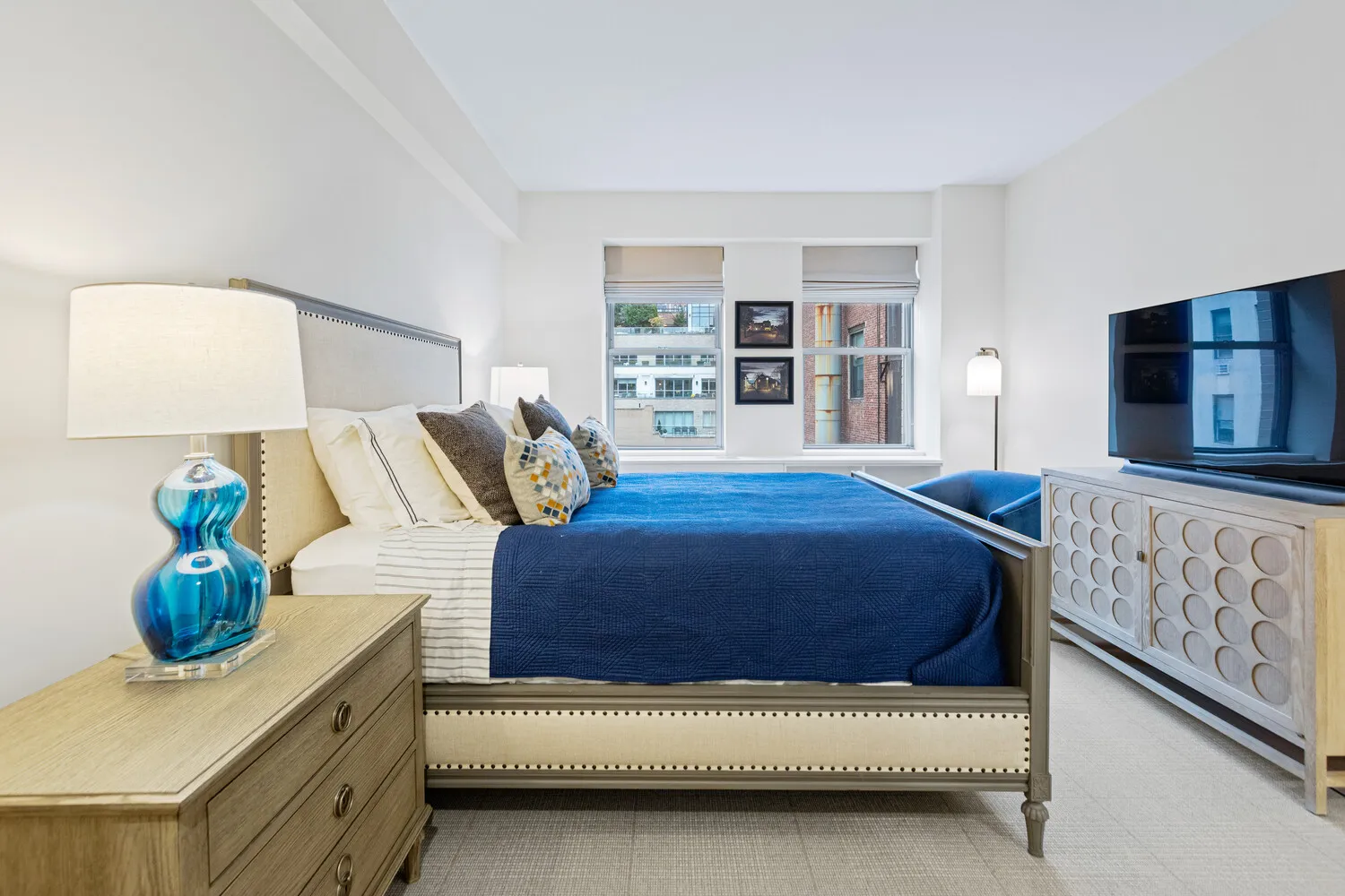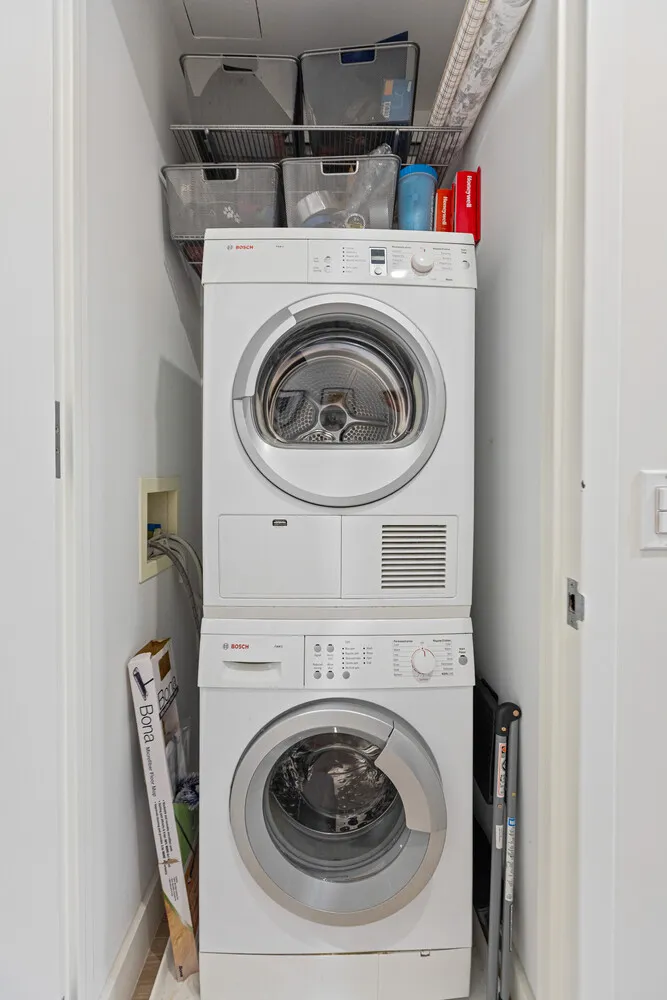 Down the gallery hall, you have a W/D and storage closet. The serene bedroom wing includes a spacious primary suite with custom closets and a stunning tiled en-suite bathroom with a soaking tub, glass-enclosed shower, and custom Italian vanity. The secondary bedroom offers open northern city views of the Empire State Building and custom storage.