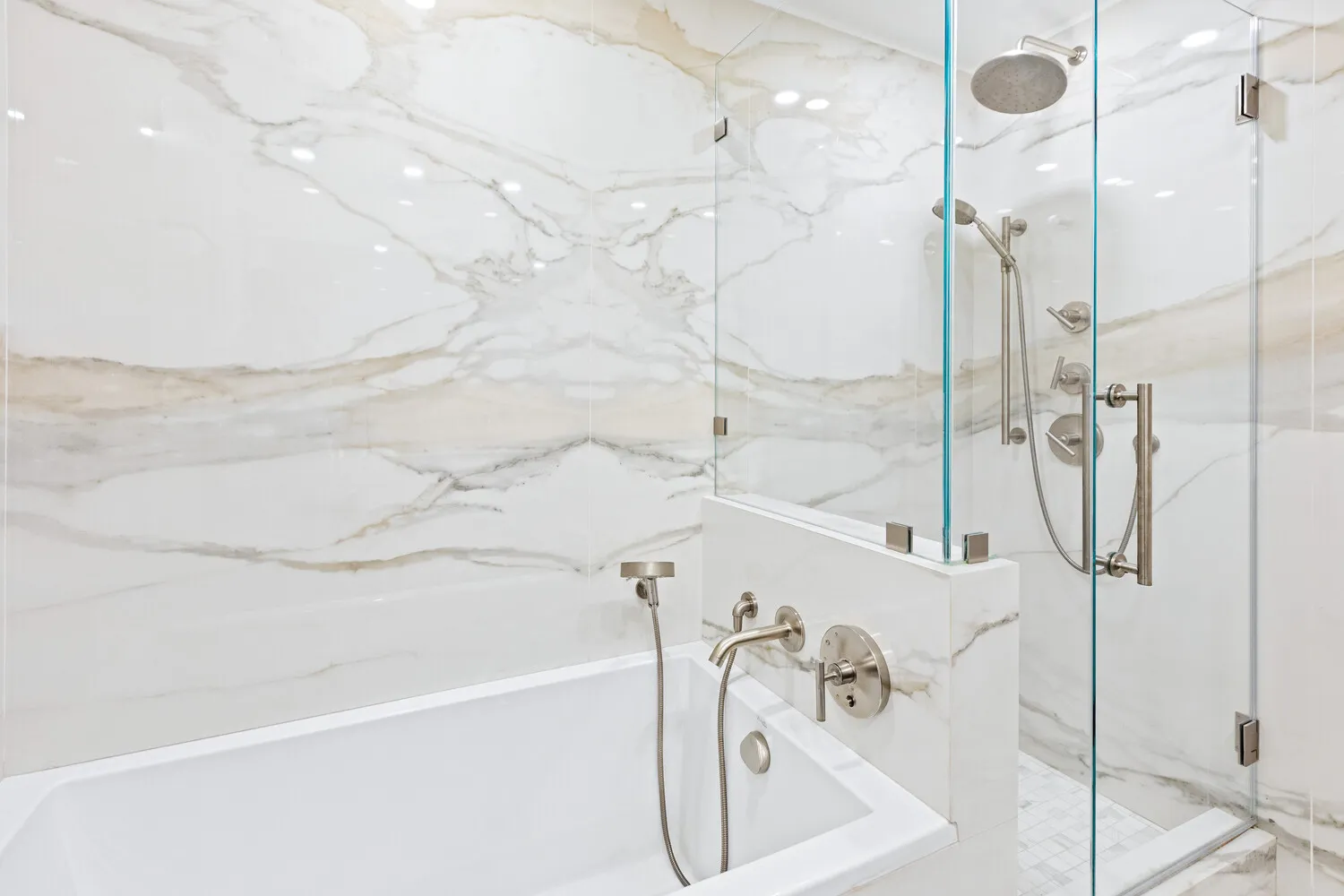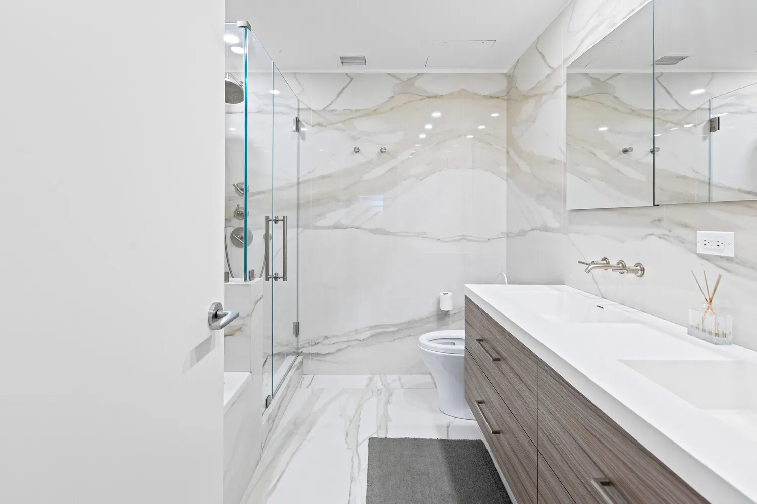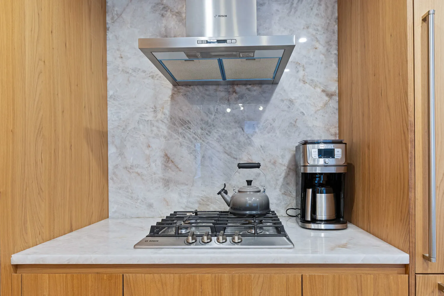 The open chef's kitchen-custom-designed and crafted in Italy features Cristallo Quartzite counters and backsplash, imported bleached Italian walnut cabinetry, Bosch appliances, and concealed storage for a seamless, sophisticated aesthetic.