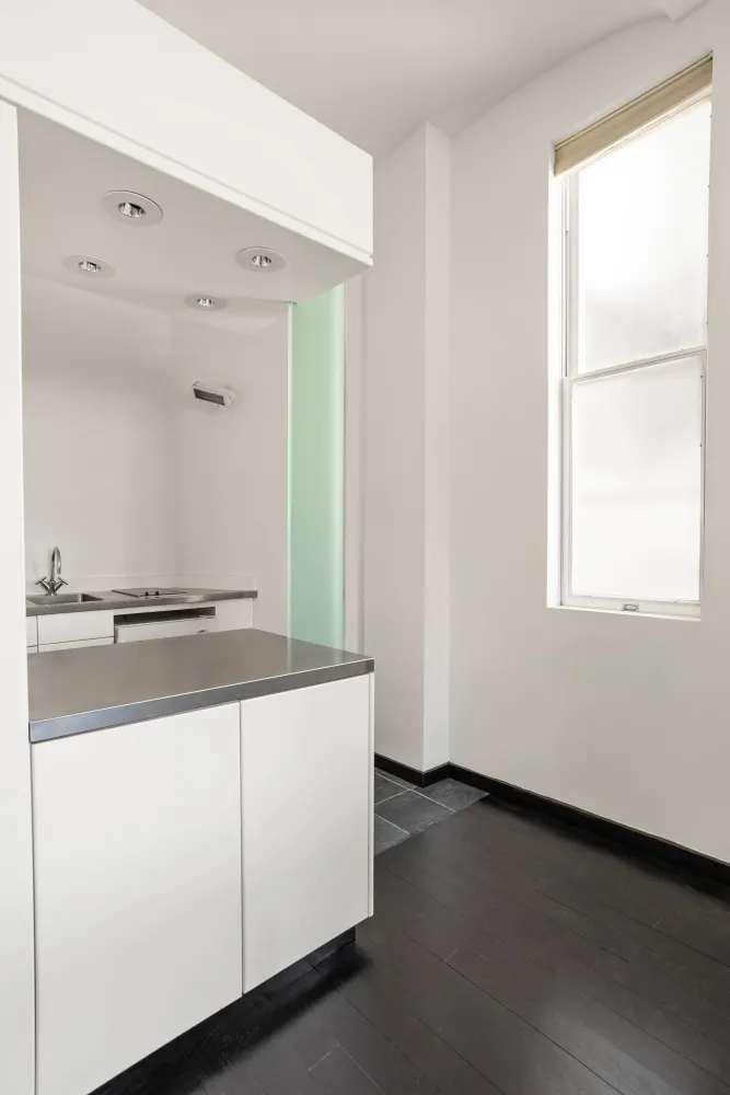 The kitchen has a classic layout with good storage and counter space, perfect for cooking or hosting small gatherings. It's a functional space that fits well with the building's artistic roots.