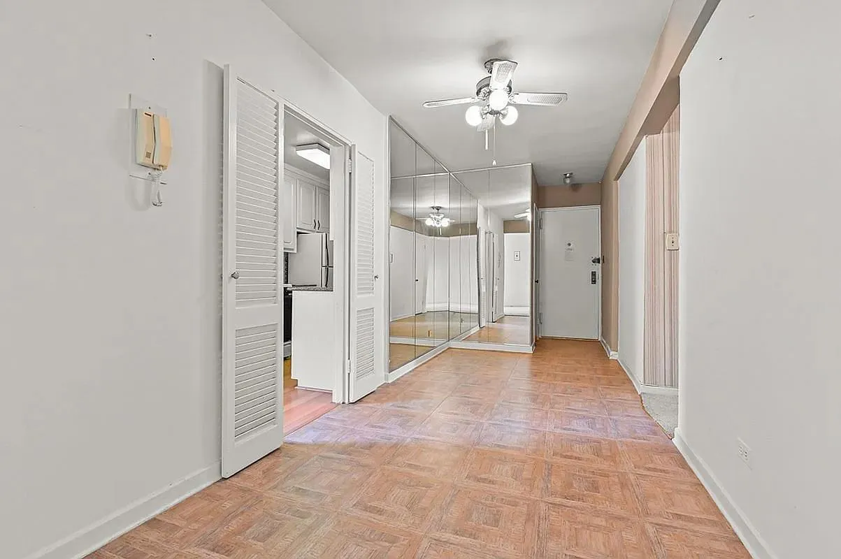 Down the hall, pass multiple closets before reaching the bedroom. The room easily accommodates a king bed and full furniture suite, all while enjoying excellent natural light. Two additional closets bring the total to five. An eat-in, galley-style kitchen completes the home, offering a practical setup for any home cook. A true Brighton Beach standout.