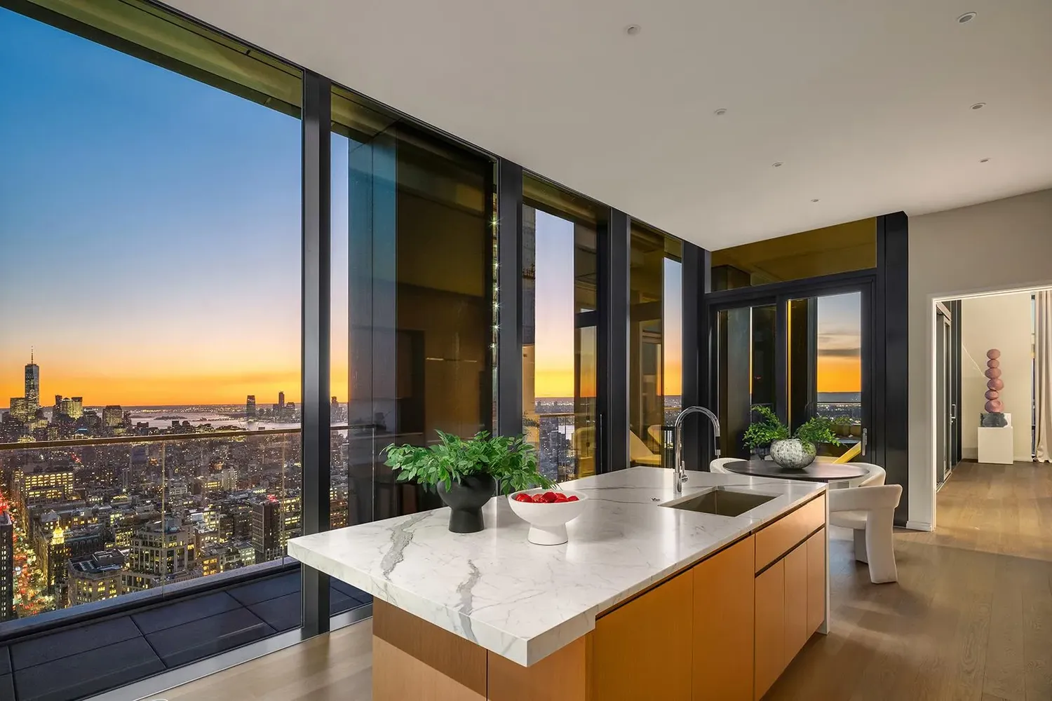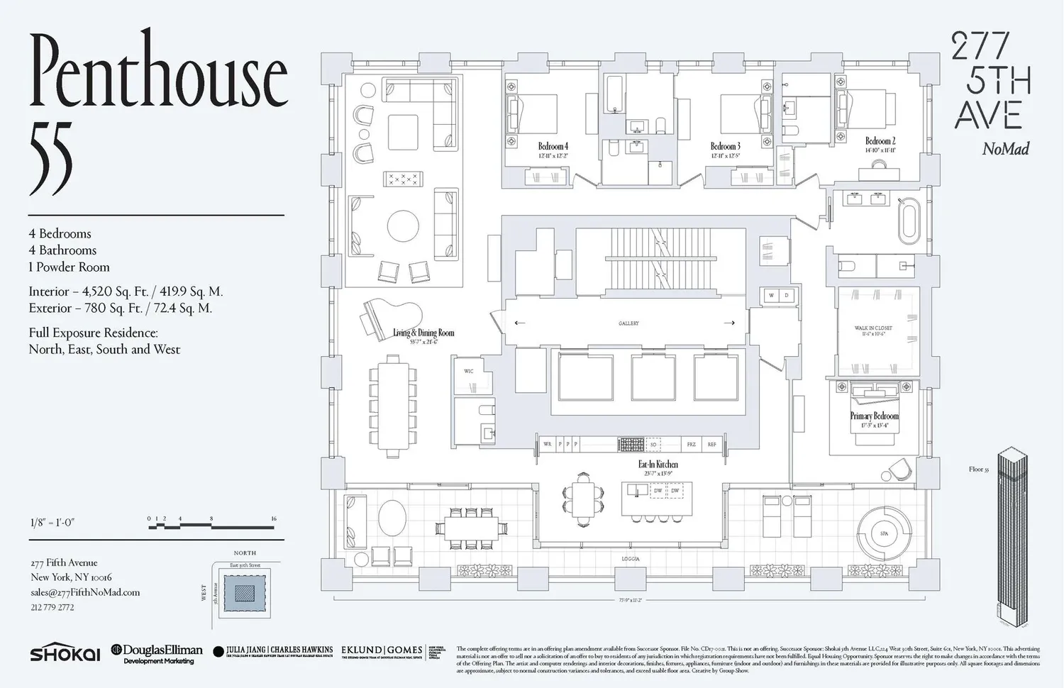 Penthouse 55 at 277 Fifth Avenue is a spectacular full-floor, four-bedroom residence spanning 4,520 interior SF and 780 exterior SF with unparalleled views across the city and beyond. Accessed by a keyed elevator, Penthouse 55 opens up into an expansive, 53" x 21" Great Room with sweeping views of the Hudson River, framed by floor-to-ceiling windows. Take in dazzling sunsets from the adjacent 75-foot-long private loggia.