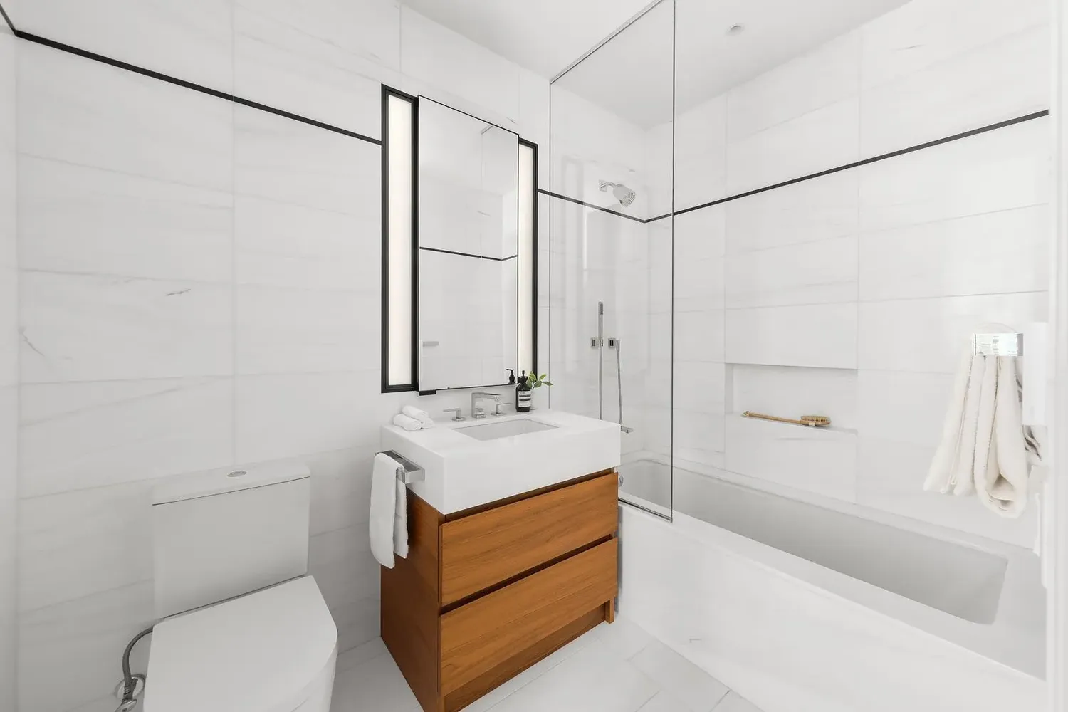 The primary bedroom suite, with Southern and Eastern exposures, opens onto a private portion of the loggia with an outdoor spa, and also is also provided with oversized dressing room with a custom, built-in closet system. The windowed five-fixture primary bathroom features a walnut vanity with a Dolomiti marble countertop, full-height San Nicola marble slab walls, radiant heated Bianco Dolomiti marble floors, an elegant standalone tub and water closet by Duravit, and a glass-enclosed walk-in shower with rain and handheld shower heads.