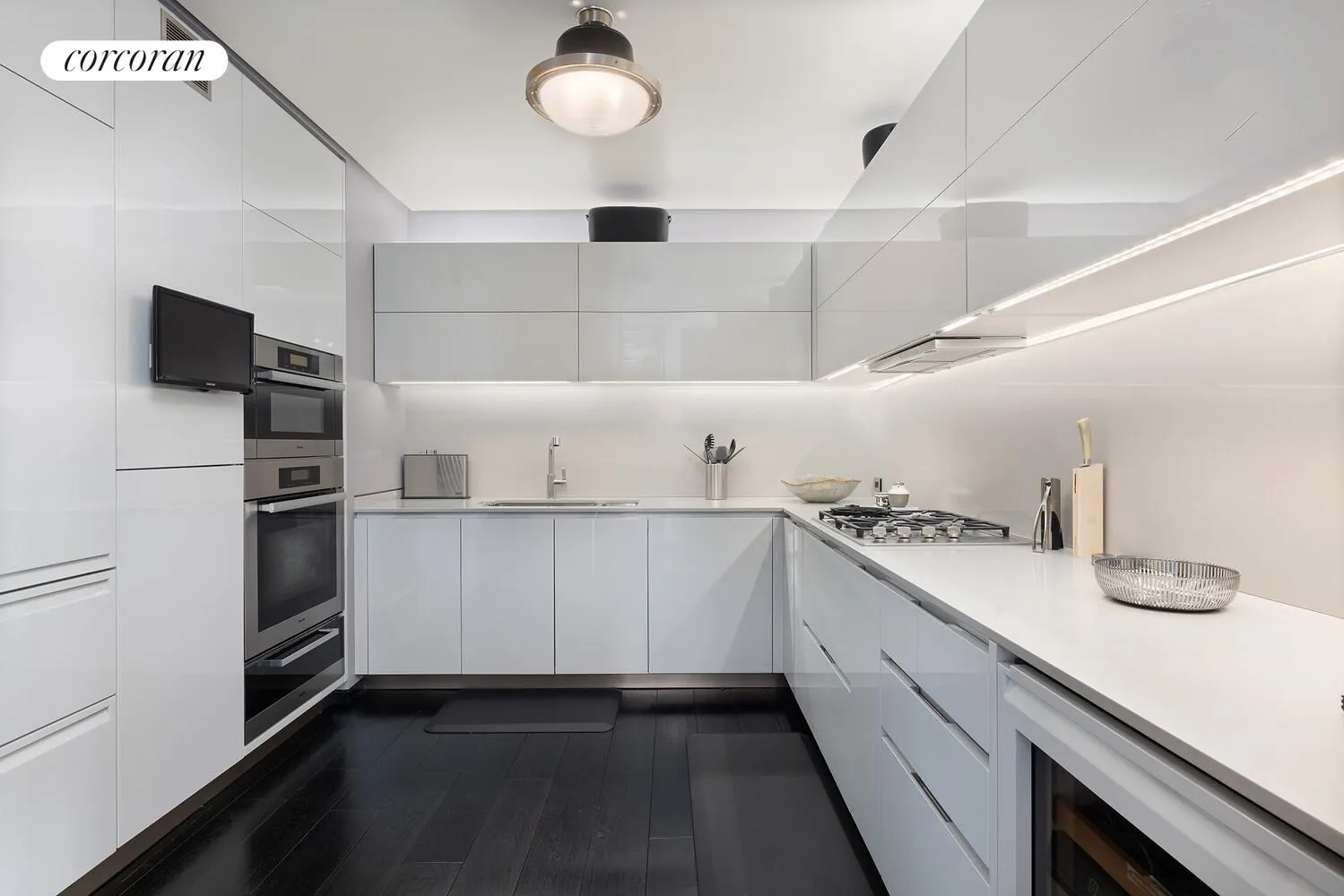 The Italian Poliform kitchen is a centerpiece of style and functionality, featuring custom cabinetry, slate countertops, and a complete suite of Miele appliances including a wine refrigerator and dishwasher. Its thoughtful design combines sleek finishes with everyday practicality, making it a chef's delight.