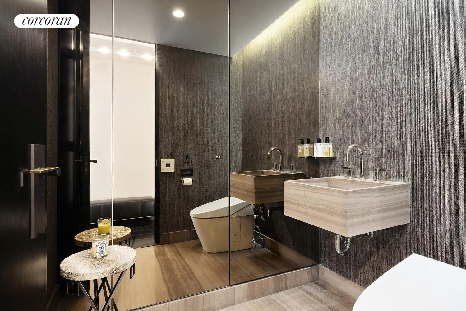 The private quarters are designed with indulgent detail. The primary suite offers an Italian Poliform walk-in closet with silk carpeting underfoot, and a spa-like bath with a soaking tub, enclosed steam shower, dual sinks, heated floors, towel warmer, and a Toto electronic toilet. Two additional en-suite bedrooms also feature silk carpets, Poliform wardrobes, heated bathroom floors, and Toto toilets, while a flexible den with an adjoining full bath provides the perfect retreat for a home office, library, or guest space.