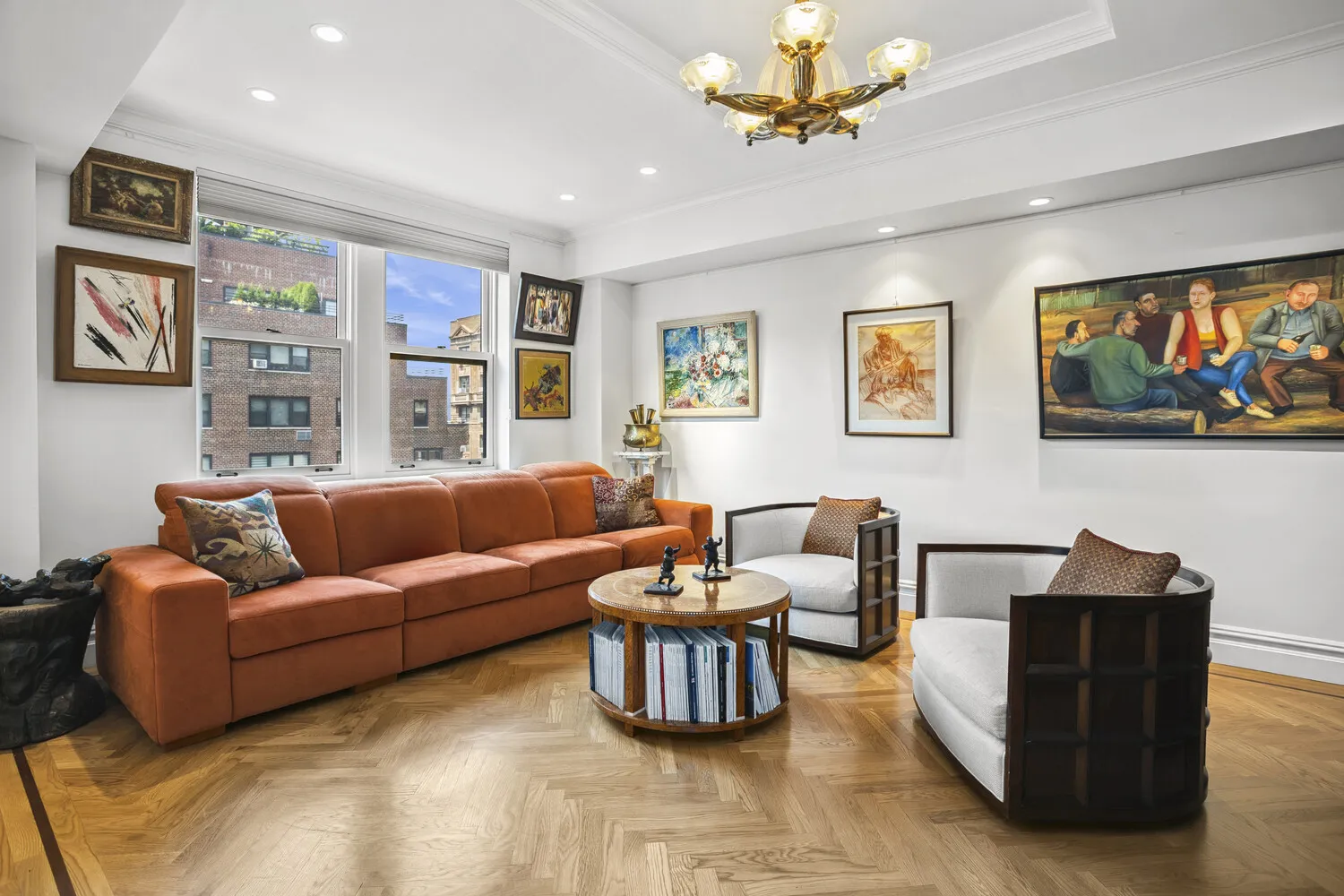 Other features include beautiful herringbone oak floors throughout, elegant crown and baseboard moldings, a two-zone central air conditioning system, as well as custom lighting and built-ins throughout.