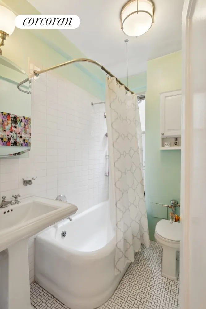 A gracious entry foyer leads to a spacious living room with 9' 4" beamed ceilings and lovely hardwood floors. This large room offers a flexible layout and can accommodate multiple seating arrangements, as well as a dining area and home office. The renovated kitchen is finished with handsome custom cabinetry, stainless steel appliances and room for a delightful breakfast table by the window. The expansive bedroom is pin drop quiet and boasts an oversized walk-in closet. A windowed bathroom has been tastefully updated while retaining its prewar charm with a mosaic tiled floor, subway tiled walls, a pedestal sink and classic bathtub/shower combination. The apartment is complete with through-wall AC and 3 large closets, all custom designed to maximize storage.