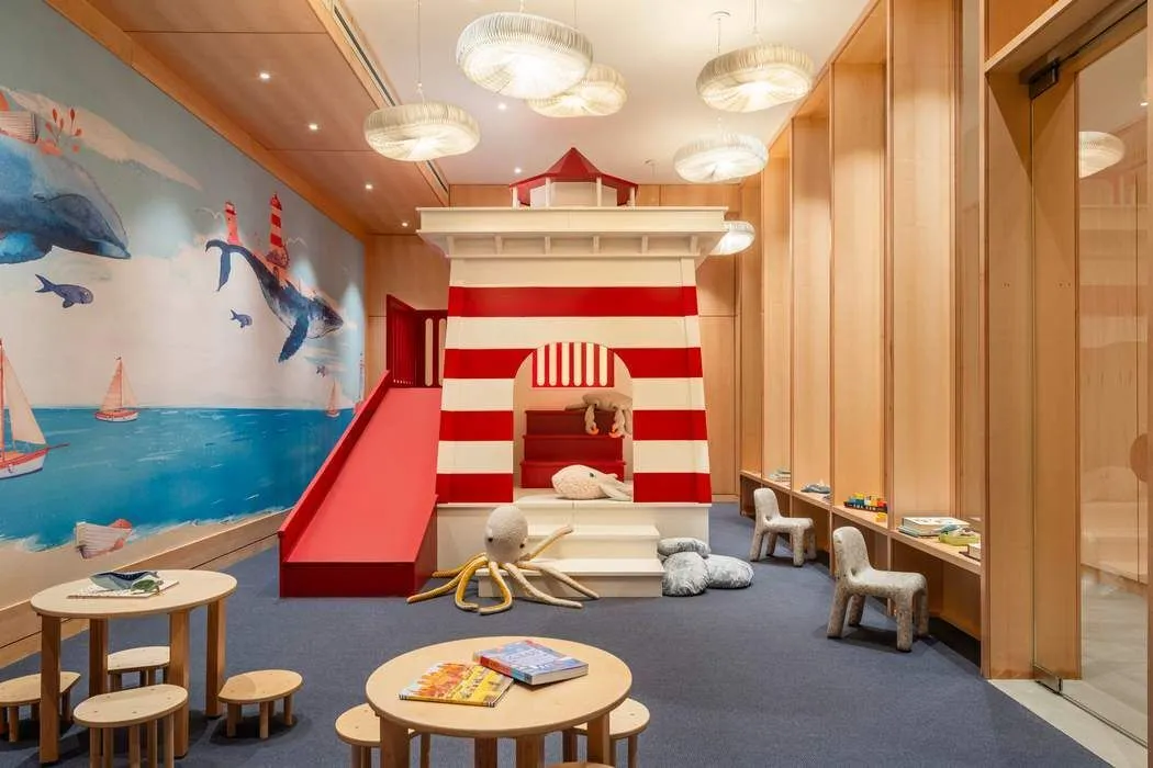 The Garden level features our ground floor amenities. Through a private entry court, a contemporary porte coche`re welcomes you to a sheltered vestibule, and to the building’s triple-height lobby. The fully serviced lobby features a sculpture by Jacob Hashimoto and floor-to-ceiling window walls. Adjoining the lobby is the private garden lounge, perfect for reading a book, while overlooking the MPFP-landscaped Gair Gardens. Located in the building’s lower level, The Club is all about fun and fitness, complete with a game lounge, bar, two-lane bowling alley, state-of-the-art fitness center, spin studio, boxing gym, private locker rooms and maritime-themed kid’s playroom. The Bridge level of Olympia is located on the 10th floor and offers a variety of indoor and outdoor amenities dedicated to recreation and relaxation. Features include a 60’ indoor lap pool, wellness amenities, juice bar, a 58’ outdoor pool and hot tub, cabanas, barbecue areas, children’s ship-inspired playground & waterpark, and a full-size tennis court overlooking the Brooklyn Bridge, lower Manhattan and beyond. Additional services include private on-site parking available for rent or purchase, 24-hour doorman and concierge, package room with refrigerated storage, bicycle storage and private residential storage available for purchase.