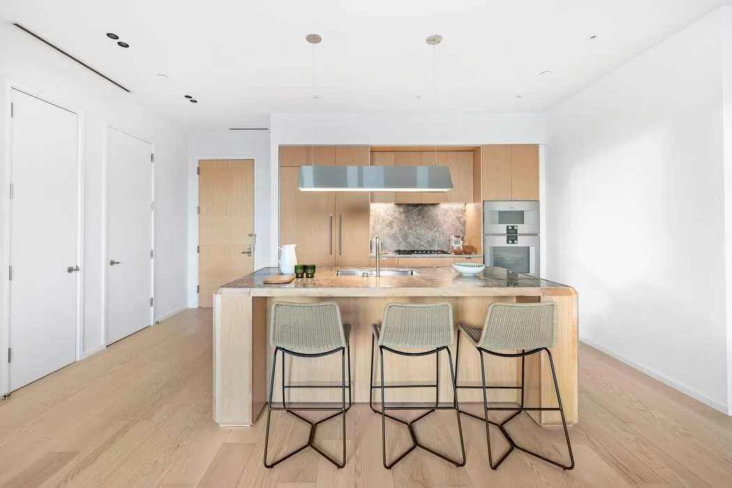 Upon entry, the foyer leads into a light-filled open plan kitchen and living/dining area that is crafted with a strong attention to detail. The Workstead-designed kitchen is crafted with raked maple cabinetry paired with satin nickel hardware, Gaggenau appliances. The kitchen features a statement island with inlaid Fior di Bosco stone slab and chamfered edges.
