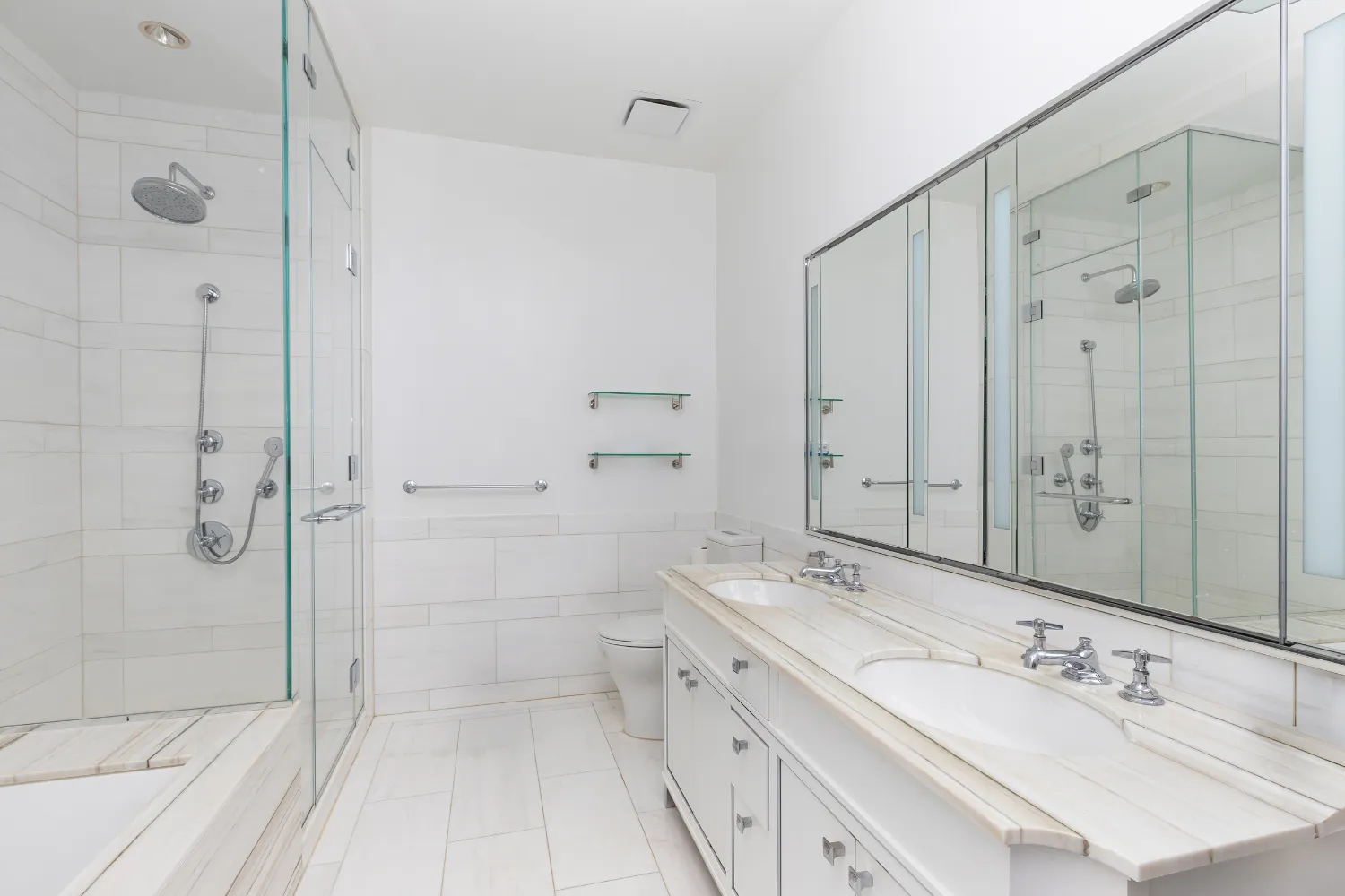 The private primary suite occupies a quiet corner of the residence and includes dual closets and a spa-inspired marble bath. A well proportioned second bedroom and an additional powder room complete this two bedroom , two and a half bath layout.