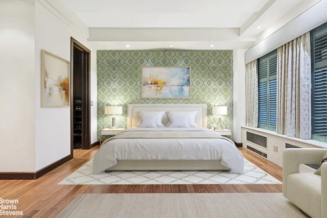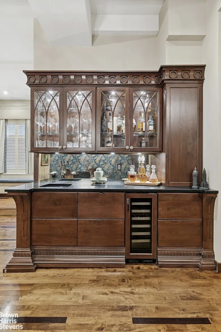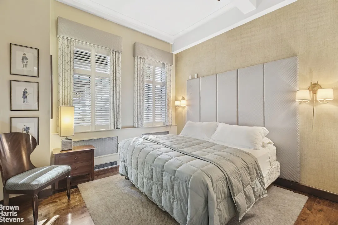 Your private entrance opens into a grand space with 12-foot ceilings throughout. The tiled foyer features a window seat, and step down into the living space. The open layout is truly versatile for entertaining or designing the right space for your needs. With a comfortable living space, large separate dining area, open chef's kitchen, and beautiful solid wood built-in china cabinet and glass-fronted bar, your living space is complete. The adjacent den offers a built-in desk and home office area. This space can easily be utilized as a third bedroom, study, library, or media room. The open kitchen is complete with custom cabinetry, Miele appliances, granite counter-tops, and generous storage space. On one side of the apartment, the massive primary bedroom caps this spacious residence, with full sitting area, large walk-in closet with washer and dryer, and spa-like bathroom. Next to the den, the second bedroom, which basks in the morning light, has a large en suite bathroom. Other apartment features include new casement windows, plantation window shutters, hardwood floors, high ceilings, and beautiful craftsmanship throughout. Your new home sits just steps from Central Park.
