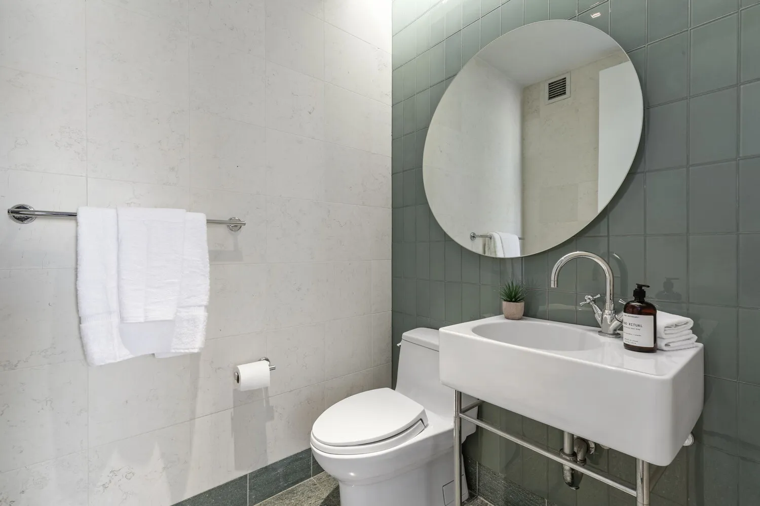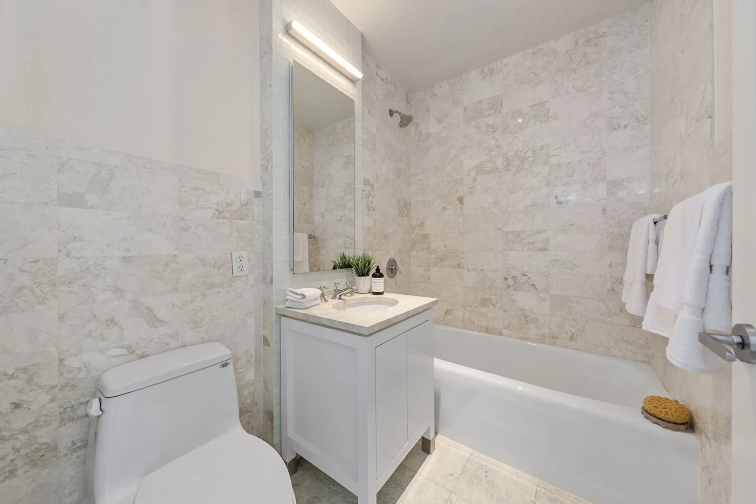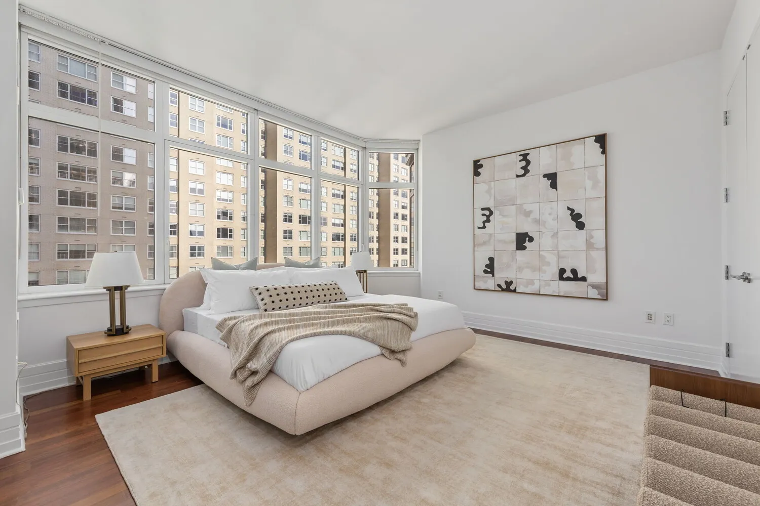 The primary suite is complemented by a sumptuous five-fixture en-suite bath with double sinks, frameless glass shower doors, beautiful honed stone, white/grey marble and a separate soaking tub. Waterworks fixtures add to the impeccable detail in all the bathrooms. The oversized second bedroom, with sweeping city views, is equipped with a built-in desk. Additional features include central AC with individual climate control, vented washer/dryer, abundant storage, a guest powder room, custom lighting and expertly-outfitted closets, enhancing day-to-day ease.