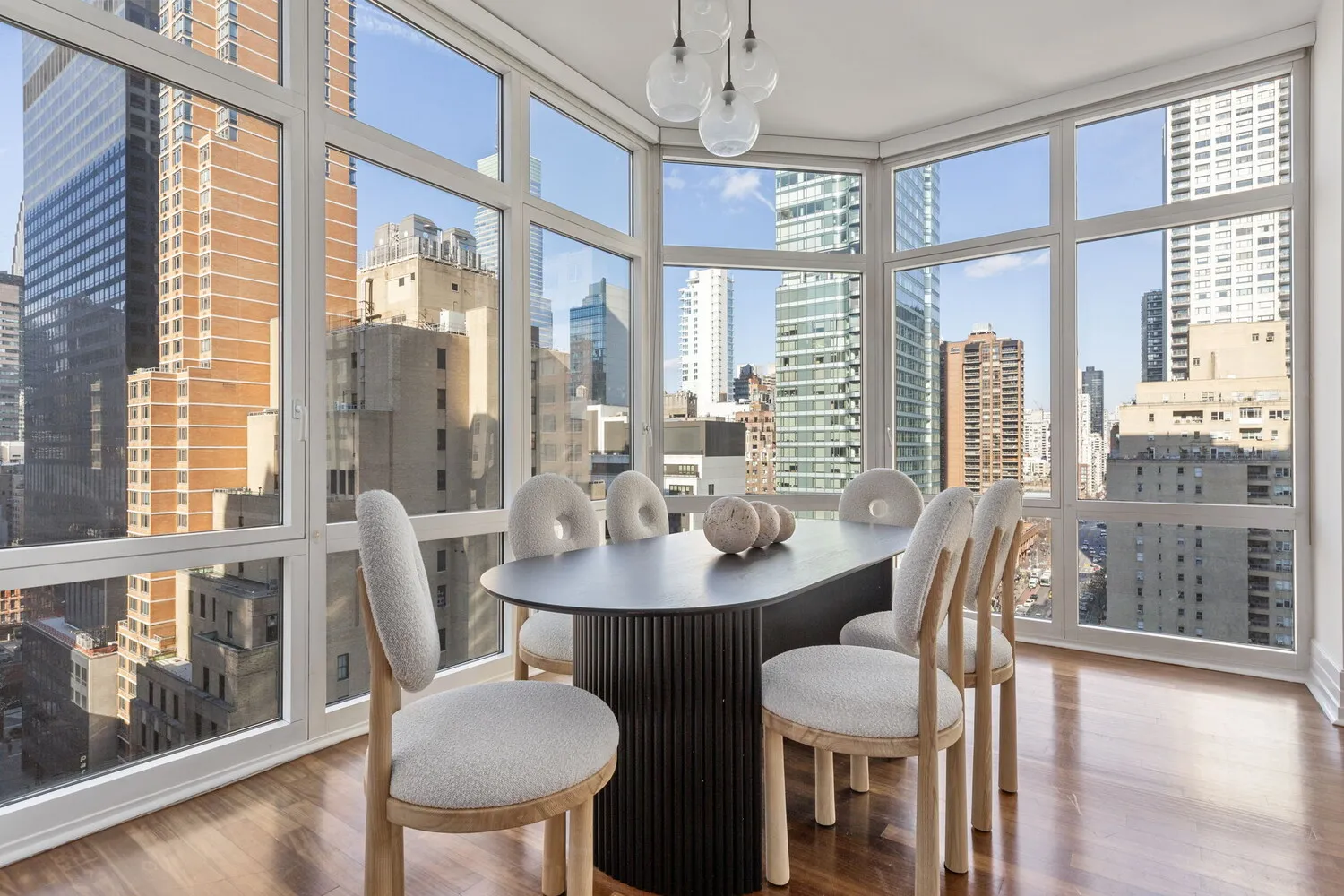 Perched on the 17th floor, this pristine Corner Two Bedroom, Two and Half Bath home offers beautiful open city views and a fantastic layout. Floor-to-ceiling windows ands oaring 10-foot ceilings flood the home with natural light throughout. Measuring in at 1,545sf/144 meters, the apartment strikes the perfect blend of scale and space. The elegant layout boasts an expansive great room, ideal for entertaining and everyday living, along with a dining area that comfortably accommodates up to eight guests.