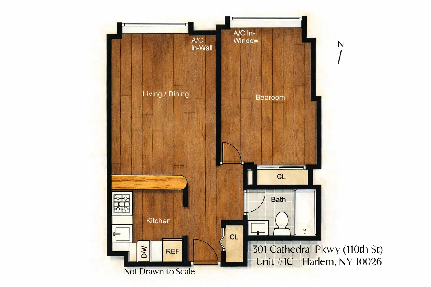The bedroom is large enough to fit a king-size bed with side tables and still have additional room for furniture as needed. Each of the closets throughout the apartment and overhead cabinets have been redone to optimize storage throughout the space.