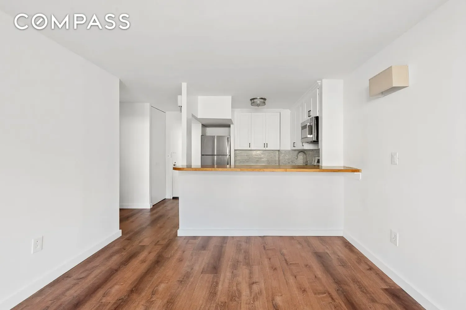 When you walk in, you'll immediately notice the gorgeously renovated open layout kitchen. Completely redone with brand new cabinets & countertops, stainless steel appliances, and a beautiful butcher-block breakfast bar! This setup is optimized for apartment flow and entertaining, as it creates additional seating options for the unit!