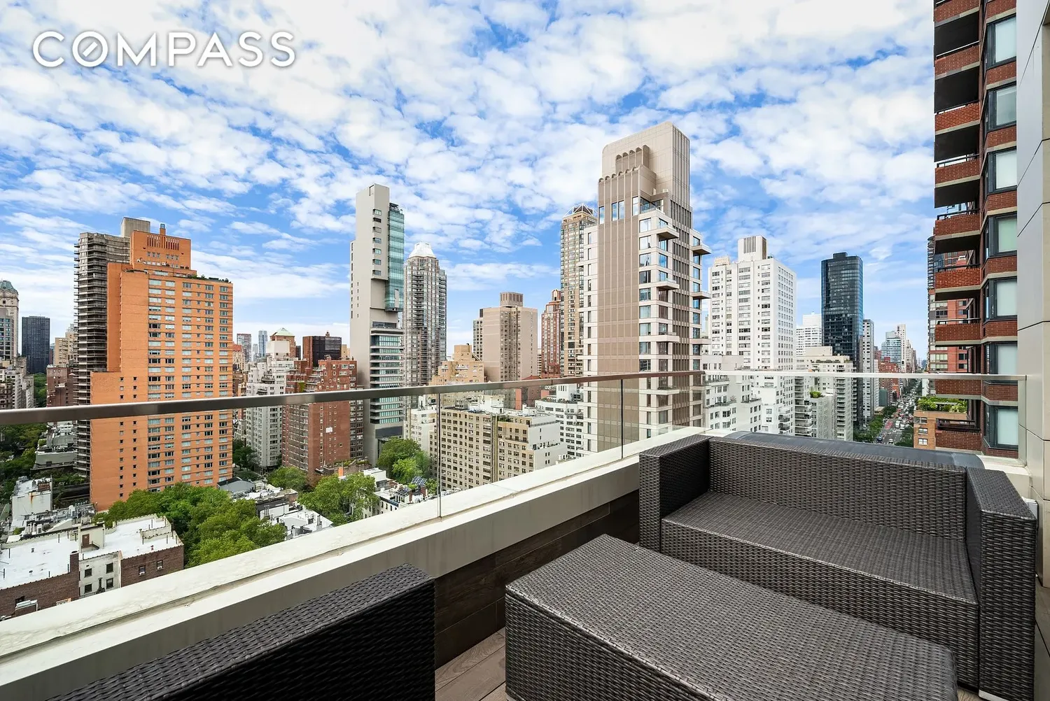 The Clare’s full floor of amenities, perched 13-stories high with 12-foot floor-to-ceiling windows, includes a fitness center and wellness studio; a spacious lounge with a dining room, living room, entertainment center, and pantry, outfitted in walnut and stainless steel; and an 800-square-foot landscaped terrace. The views are beyond magnificent, with city views towards Central Park, the Roosevelt Island Tram, the 59th Street Bridge, and Downtown.