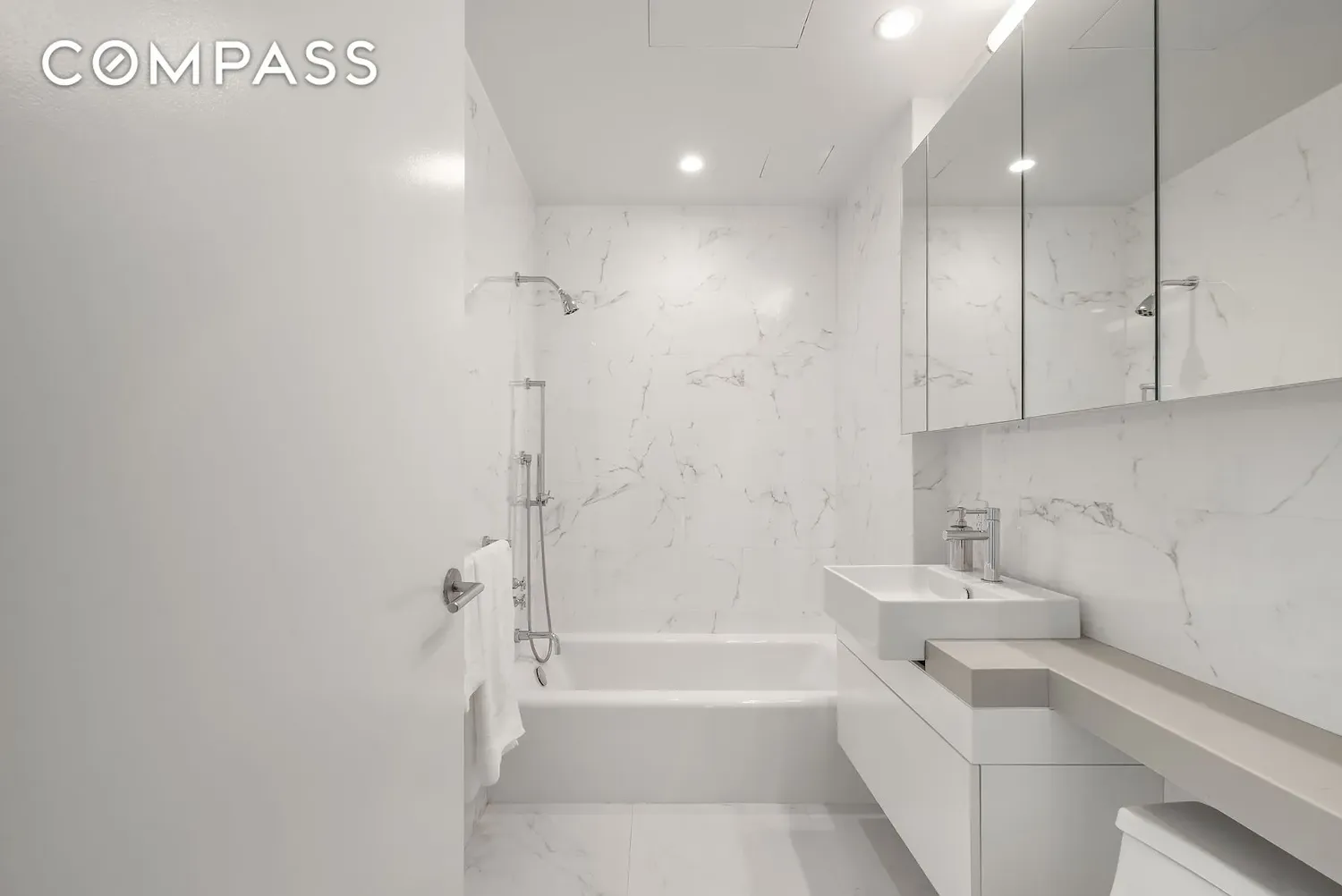 Τhis full‐floor, 3 Bedroom/3.5 Bathroom apartment, spanning nearly 2000 square feet, features walls of floor-to-ceiling windows, heated 7-inch wide white oak flooring, multi-zone heating and cooling systems, LED lighting throughout, and direct elevator access into the apartment. The finishes and color palette blend seamlessly with each other and the wide swath of visible sky.